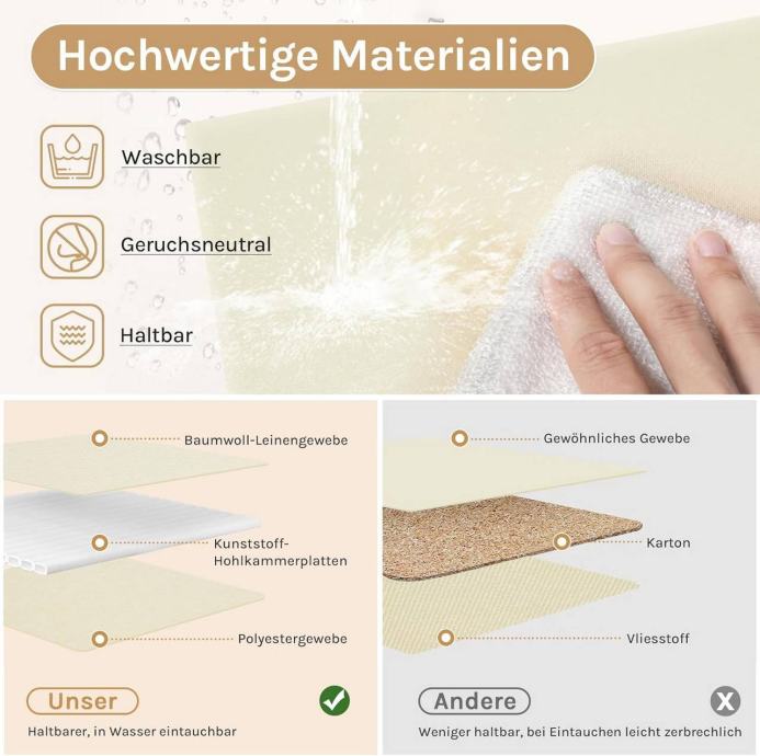 Izrađene su od visokokvalitetne poliester tkanine i čvrstog metalnog okvira. Donja ploča od plastike dodatno stabilizira kutiju i sprječava deformacije, dok materijali čine kutije izdržljivima, otpornima na habanje i gužvanje. Poklopac štiti sadržaj od prašine, a dvije čvrste ručke omogućuju jednostavno premještanje kutije.
