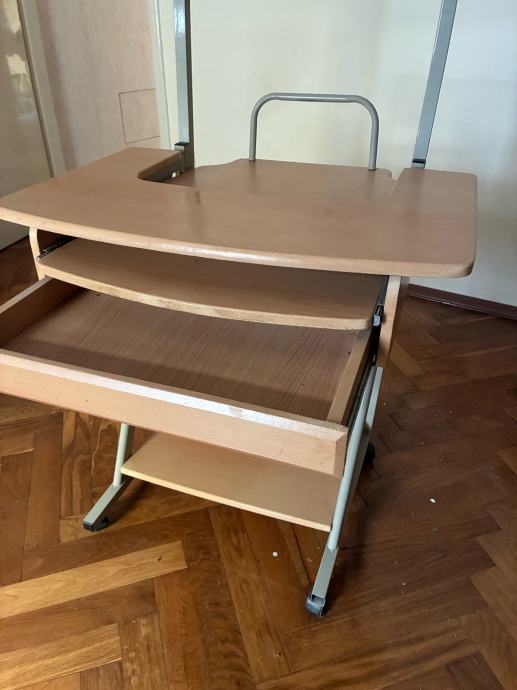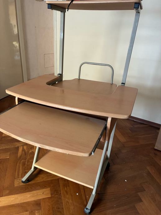 Prodajem stol za kompjuter u boji svijetlog drveta s metalnim nogama. Stol ima praktičnu izvedbu s izvlačnom policom za tipkovnicu i dodatnom ladicom za odlaganje. Radna površina je podijeljena na više razina. Kompaktan dizajn čini ga prikladnim za dječju sobu ili manje prostorije. Stol je funkcionalan i spreman za korištenje. Stol ima kotačiće pa se lako premješta.