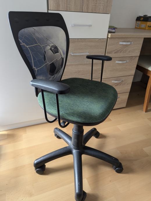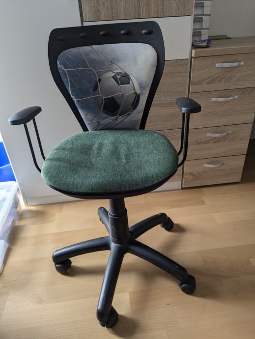 Stolica rotirajuca za radni stol, za djecu osnovnoskolskog uzrasta. Cijena je simbolicna jer se klima naslon. Postolje i sjedalo su ispravni.