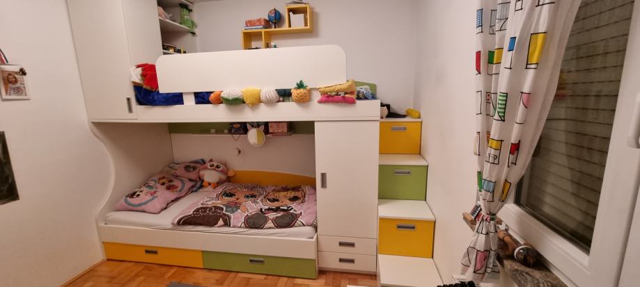 1 dio - kreveti na kat visina 255 cm / dužina 295 cm / dubina 105 cm koji se sastoje od dva kreveta 200 x 90 i 200 x 100 dvije ladice, dva ormara sa stalažama i dvoje stalaža unutar ormara.