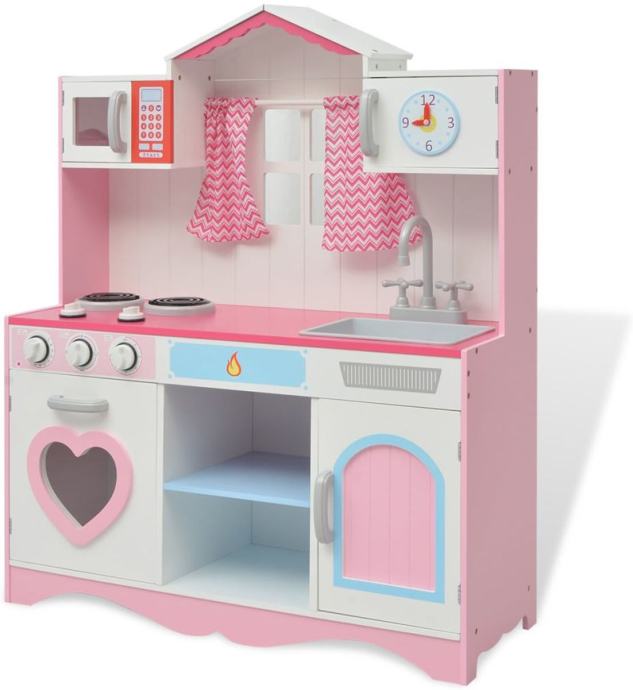 Ova ljupka i jednostavna za sastavljanje kuhinja za igranje, izrađena je od MDF-a i borovog drveta i lijepo je dizajnirana. Prozori sa zavjesama, živim bojama i tradicionalnim izgledom,čine kuhinju baš kao da je stvarna. Ima slavinu sa sudoperom i gumbima za pećnicu sa zvučnim klikom, što će iskustvo kuhanja učiniti realističnim. Štednjaci imaju 2 rotirajuće ručice koje omogućuju vašem malom kuharu da prilagodi temperaturu. Dva prostrana ormarića i polica s dvije razine, pružaju dovoljno prostora za pohranu. Sat s pokretnim kazaljkama, ukrašava vrata gornjeg ormarića kao i pećnica s dva odjeljka, a mikrovalna pećnica je osobiti dodatak.