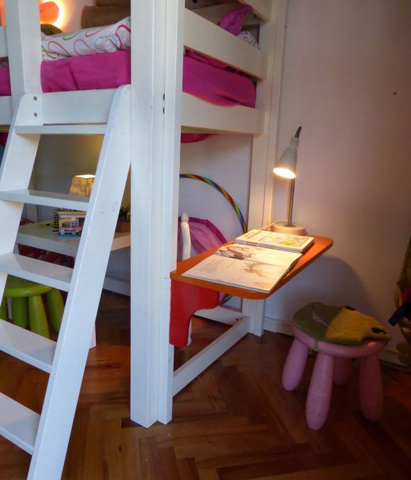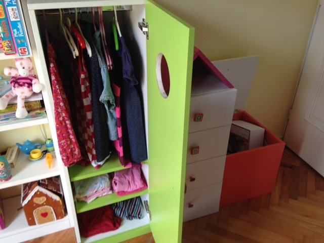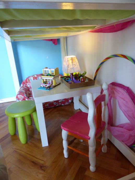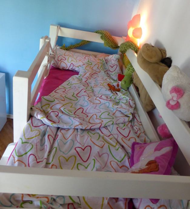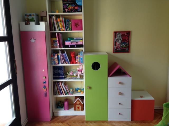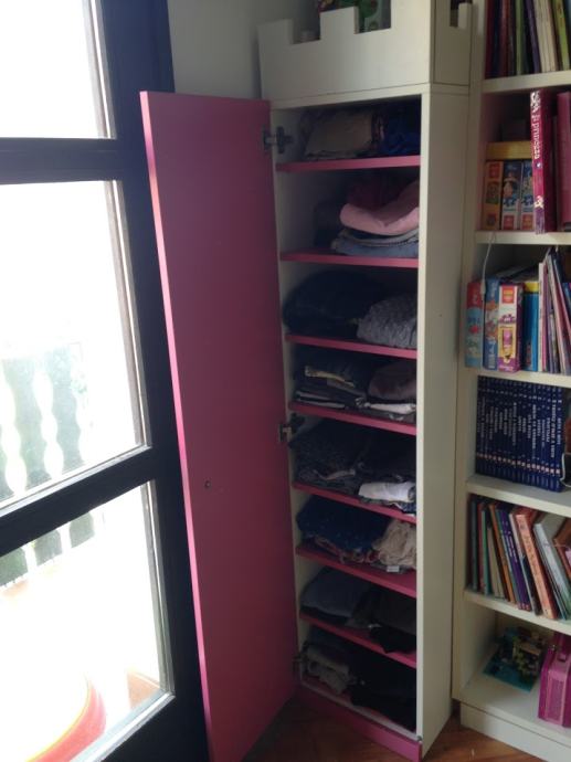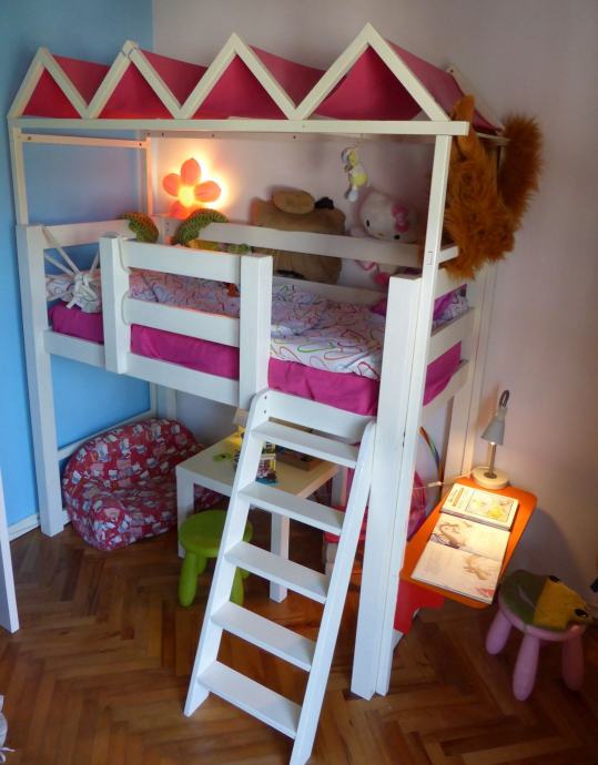 Prodajem dječju sobu za djevojčice, jer naša školarka treba novi radni prostor. Krevet je od punog bukvina drveta rađen po uzoru na Flexa krevet, ali nema tobogan, krović iznad kreveta je zaseban, i odvojiv, rađen po uzoru na Vibel namještaj za dječje sobe, i na svom vanjskom rubu ima mali stolić za crtanje, slaganje legića ili takvo što. Ormar je izrađen od iverala, elementi odvojivi pa mogu stajati i zasebno u prostoru. Na slici je i bijeli regal sa policama koja nije komplet ormara, nego naknadno dodano zbog potreba moje djevojčice, te nije uključena u cijenu (tj. ako bi i to - dobijete gratis). Ormar i krevet prilagođeni su potrebama koja prelaze iz kinderbeta u svoj krevet, djece predškolskog uzrasta, i nižih razreda osnovne škole. Krevet je spojen vijcima (rupe sakrivene), tako da ga je moguće rastaviti i prevesti u osobnom vozilu.