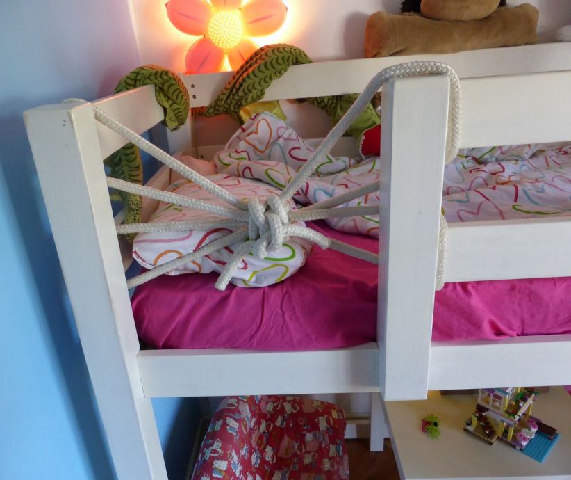 Dimenzije kreveta u cm: madrac 160x70, vanjski okvir kreveta 143 visina/90 ispod ležaja, 173 duljina, 119 širina (dubina) od vanjskog ruba kreveta do najšire točke ljestvi, okvir iznad kreveta je visok 210 cm u najvišoj točki.