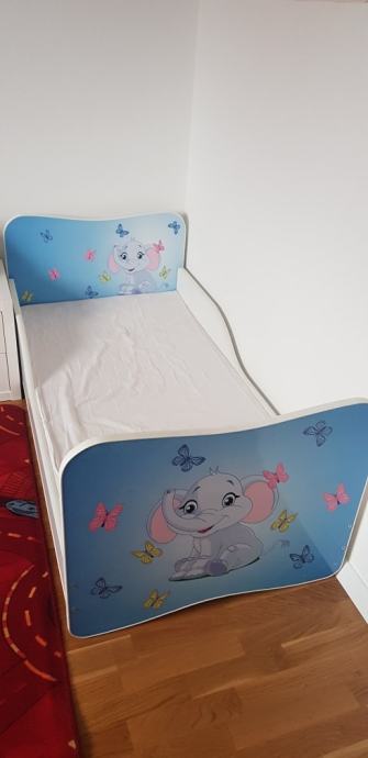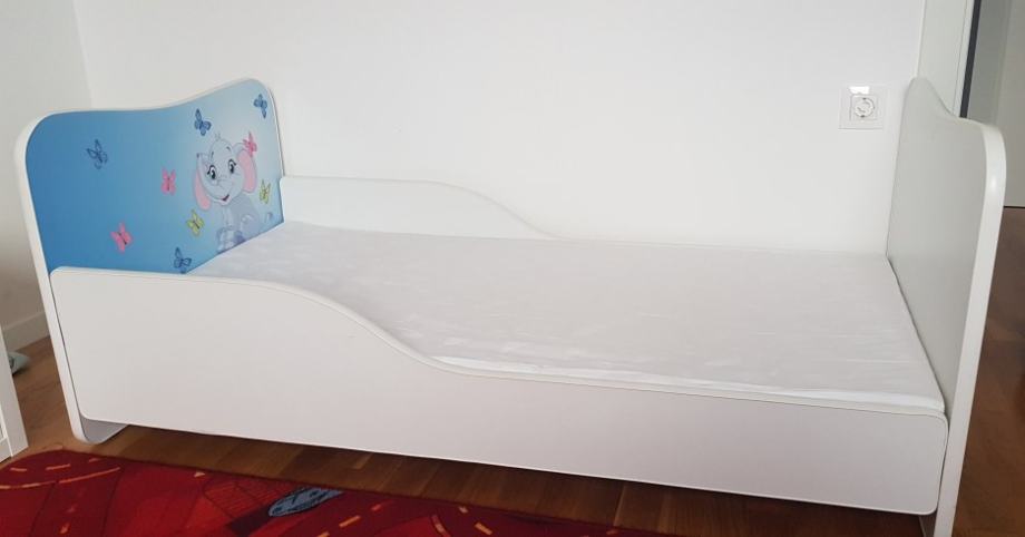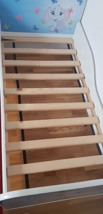 Dječji krevet u odličnom stanju. Dimenzije madraca 140x70 cm, dimenzije kreveta 144x74 cm. Visina na kojoj se nalazi lezaj 23 cm. Uz krevet ide lamelirana podnica i madrac od obične spuzve, debljine 5 cm.