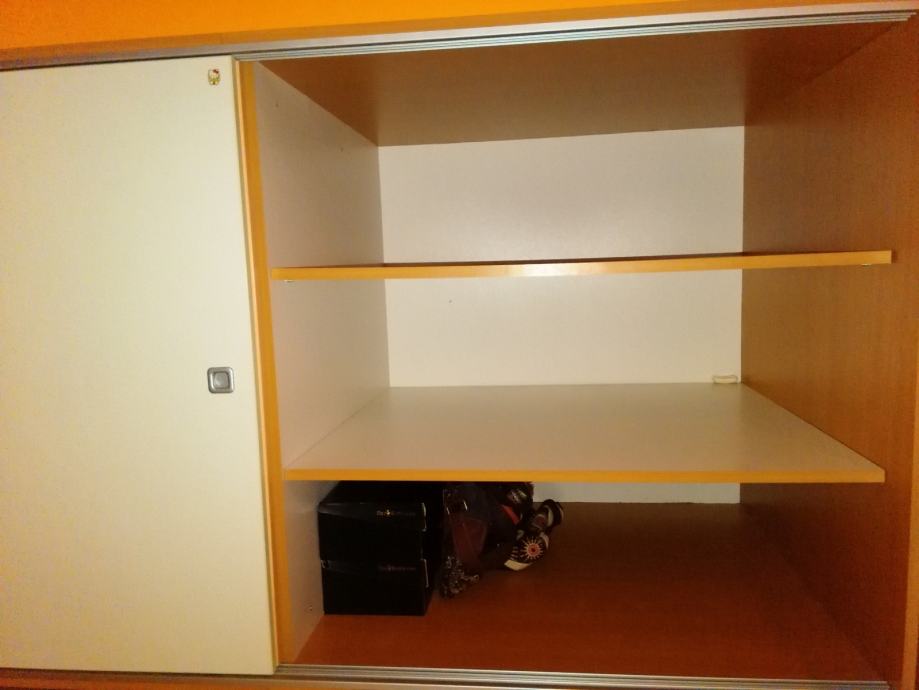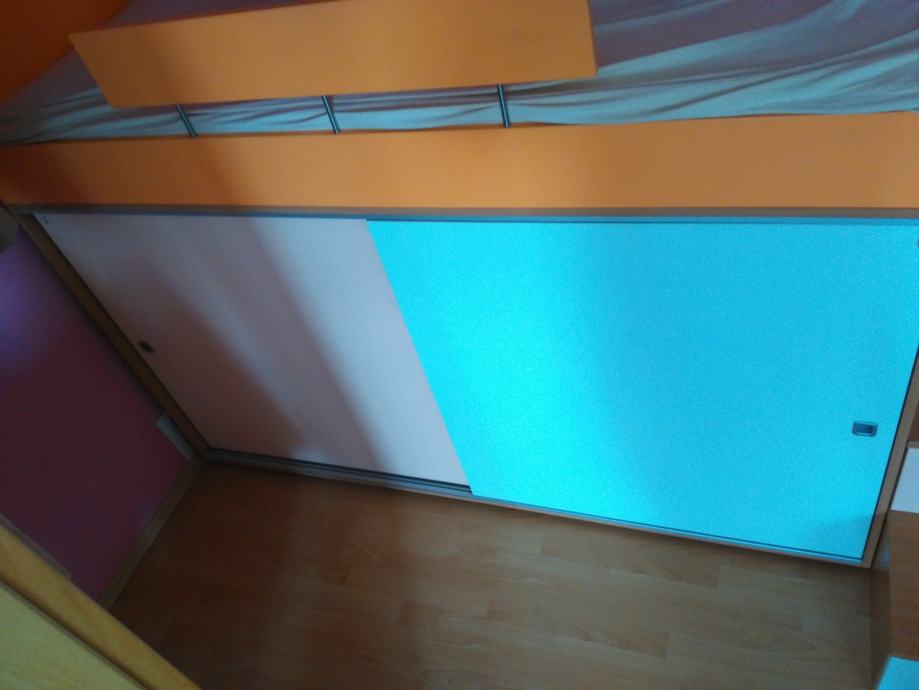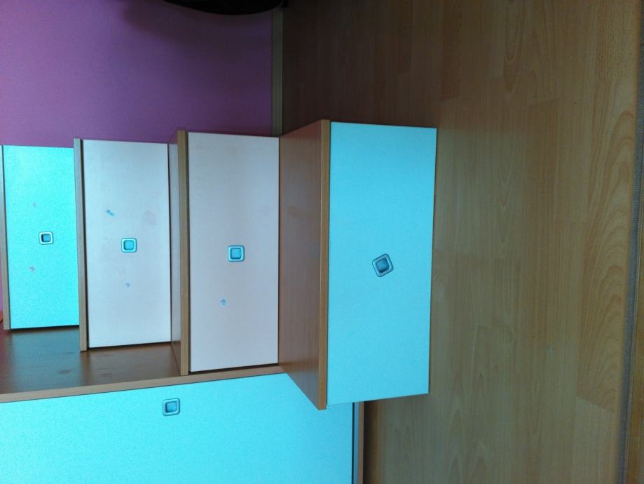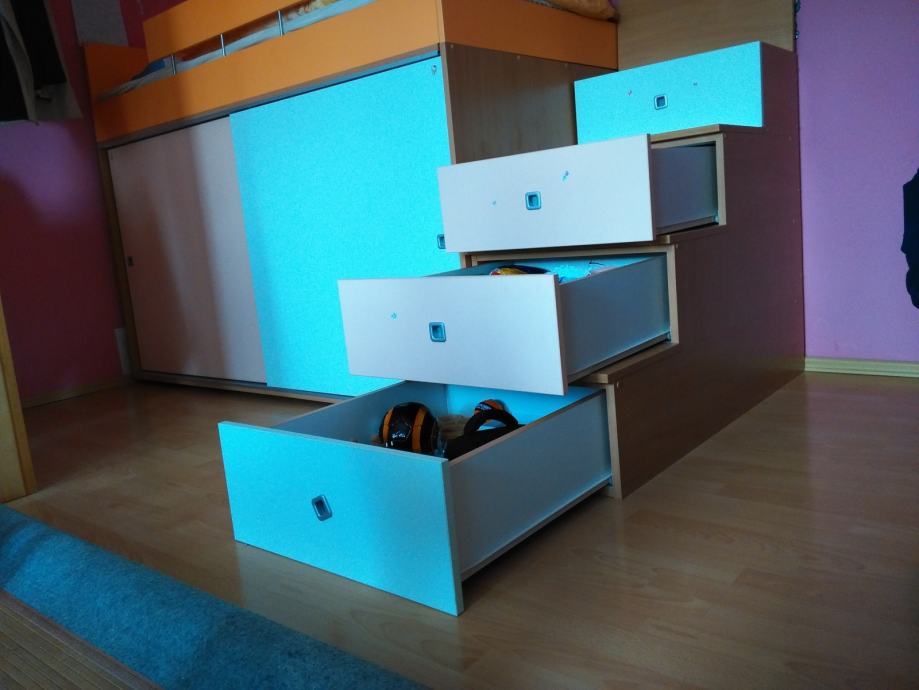 Svjetlo zeleni ormar se vidi na slici iznutra, a svjetlo rozi na prednjoj polovici ima šipku za vješalice, a iza također tri police za odjeću. Vrlo prostrani klizni ormari, kao i ladice u koje stanu knjige, igračke, donje rublje i slično. Samo prva stepenica (gornja) se otvara od gore, a ostale kao klasične ladice.