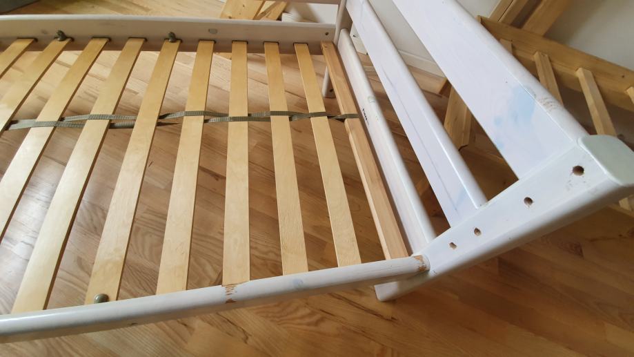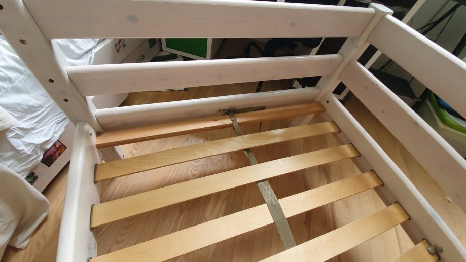 Flexa krevet od bijelog drveta. 90x200, sa podnicom. Postoji nekoliko ogrebotina od korištenja i naljepnica koje se mogu skinuti.