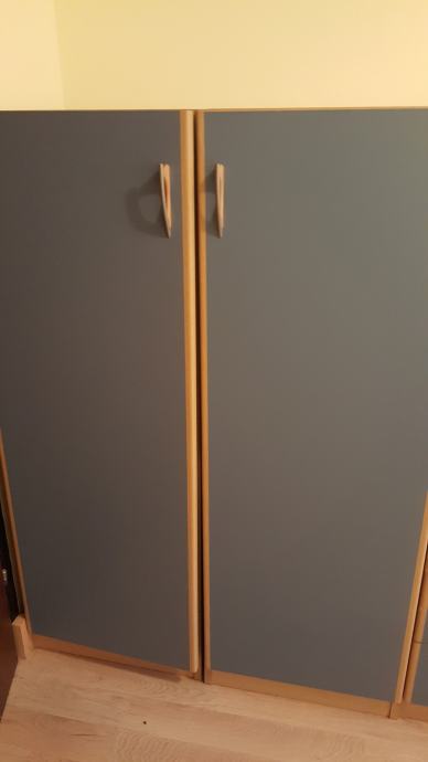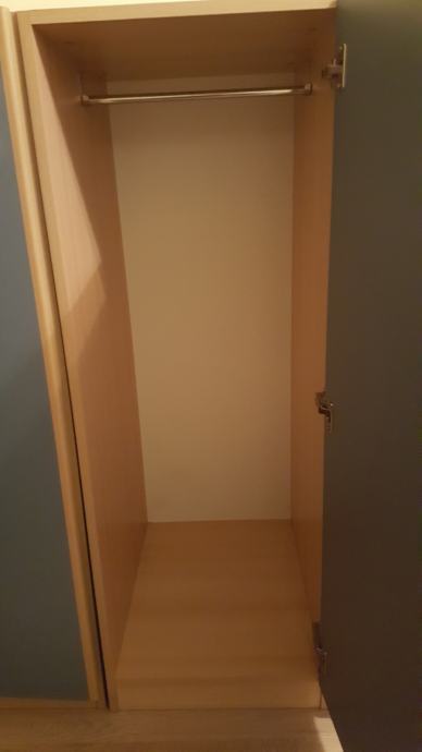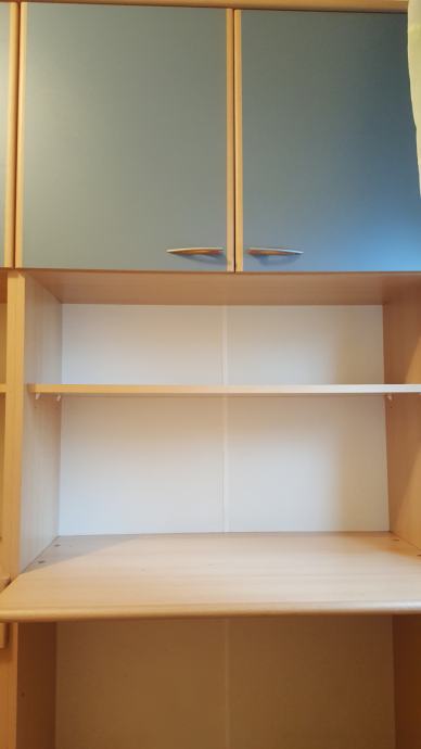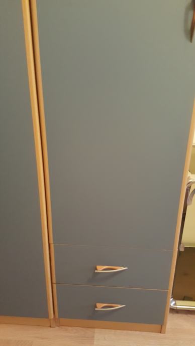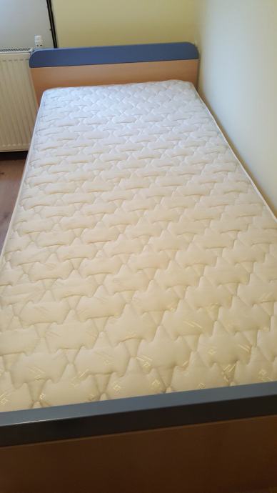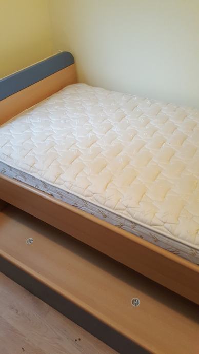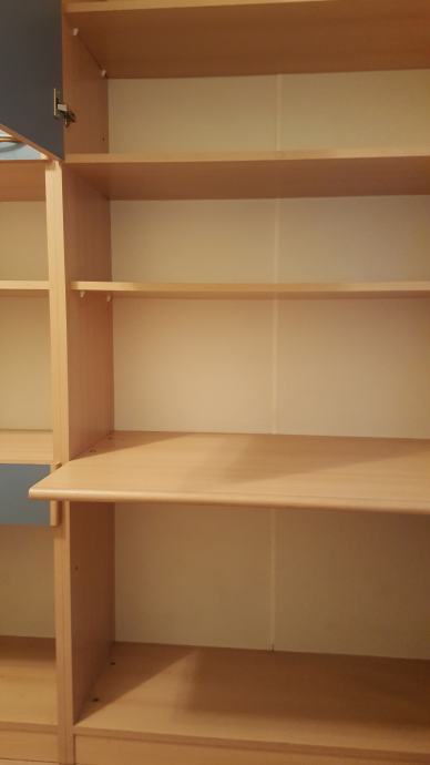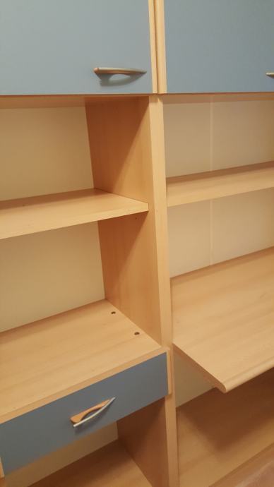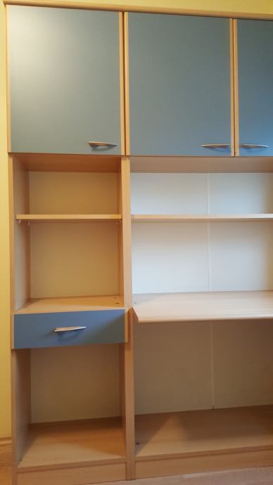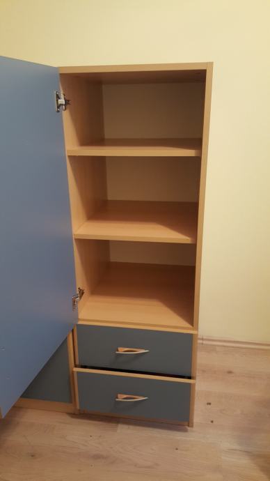 Soba u odličnom stanju plavo-bukva, bez oštećenja, minimalno korištena. Dva ormara za vješanje robe 50×140, jedan sa policama i dvije ladice 50×140. Element 50×210 sa ladicom i ormarićem, jedan element 100×210 sa radnim stolom, ormarićem za slaganje robe i donjim dijelom praznim. Krevet s ladicom s mogućnošću još jednog ležaja 95×200, HESPO madrac.