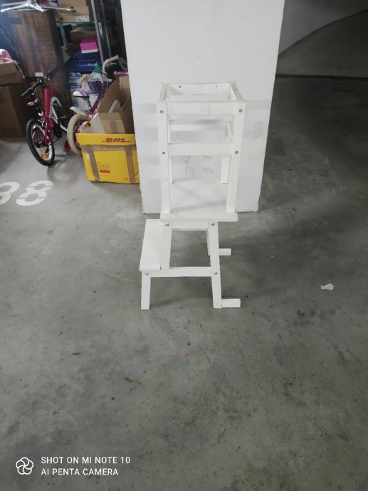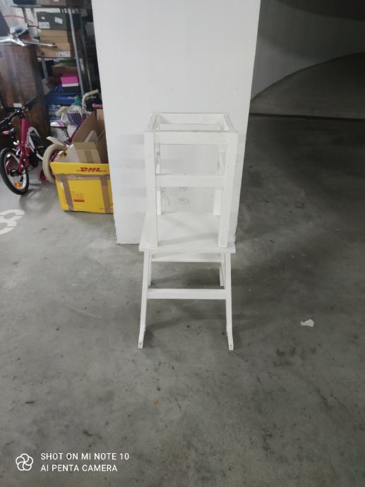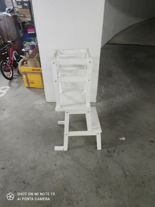Toranj slozen od IKEA Bekvam i Oddvar stolica. Dodatna ploca stavljena izmedu te produzeci na nogicama da se sprijeci prevrtanje.