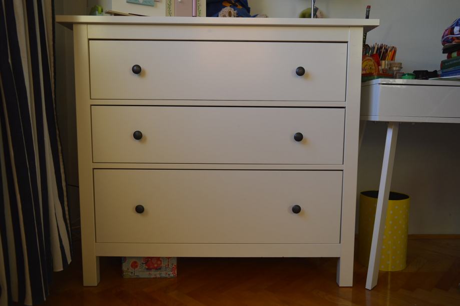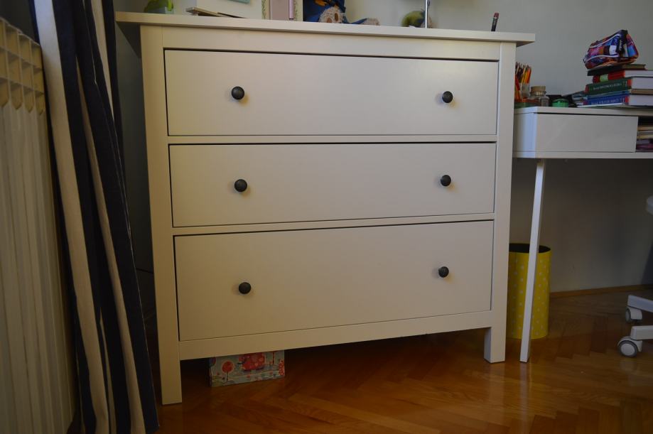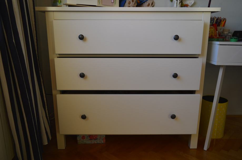 Bijela komoda s tri ladice, dimenzije: širina 110 cm, visina 96,50 cm, dubina komode 48 cm.
