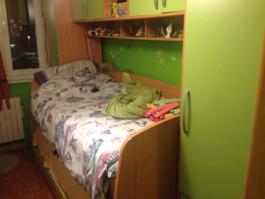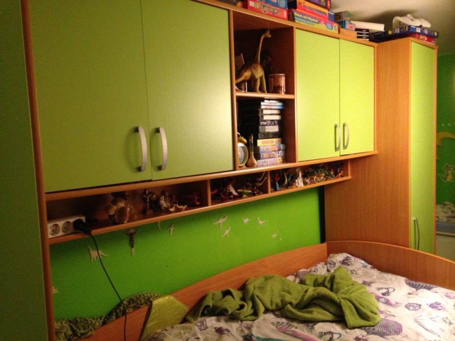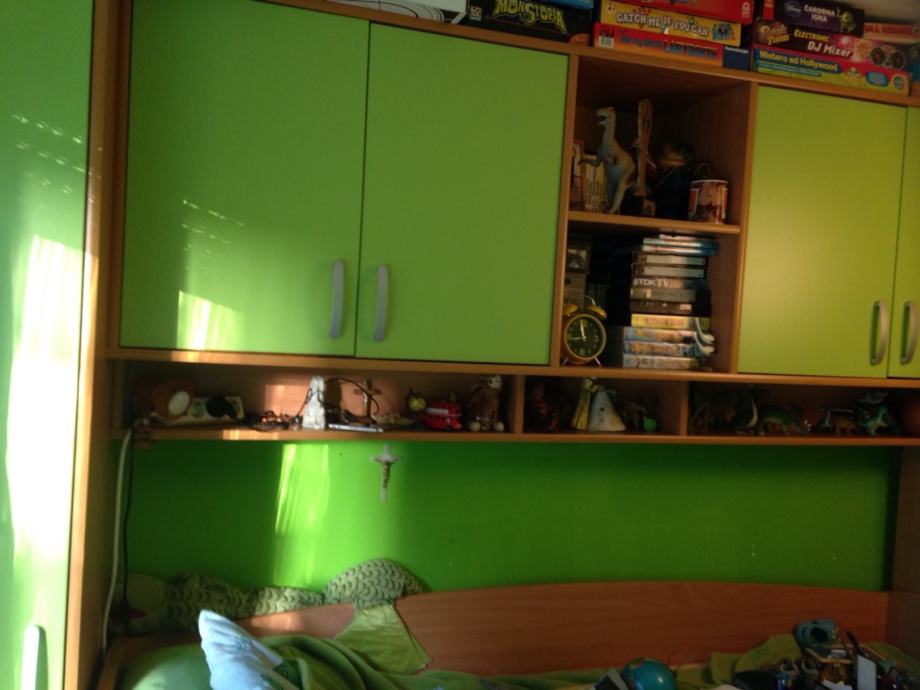 Dječja soba lateran kiki u zelenoj boji prodajem. Odlično očuvano, prodajem radi selidbe. Dva krajnja visoka ormara drže most iznad kreveta koji je na povišenom položaju a ispod njega je drugi krevet koji ispod podnice ima ladica za stvari. Ovaj komplet po kupovnoj cijeni bio je 12.000 kn. Korišteno 3 mjeseca i prodajemo ga za povoljo po cijeni niže ili po dogovoru.