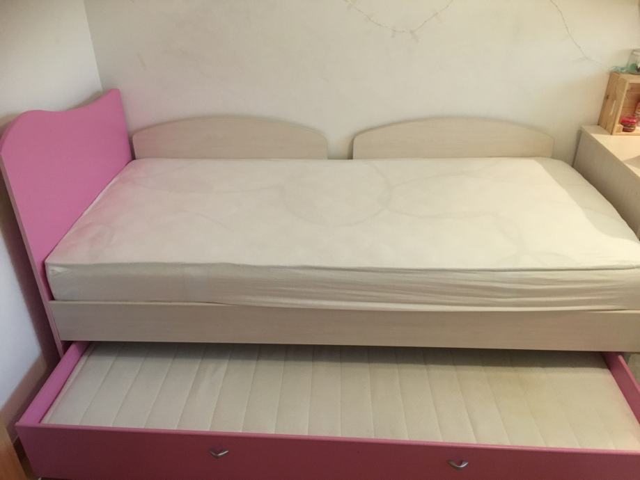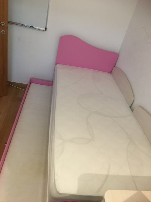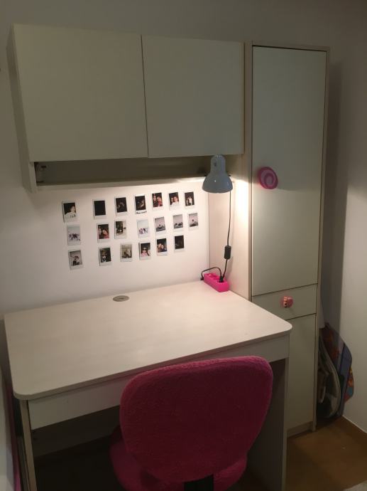 Djecja soba od 6 elemenata:krevet s ladicom koja je dodatno mjesto za spavanje +dva madraca i dvije zastitne drvene ograde;radni stol s ladicom (D-93,Š-65,V-73cm),viseci element za knjige (Š-80,V-50 cm),stojeci element za knjige s ladicom (Š-40,V-173 cm), 3-djelni ormar Š-135,V—190,Dubina 60 cm) i radna stolica!