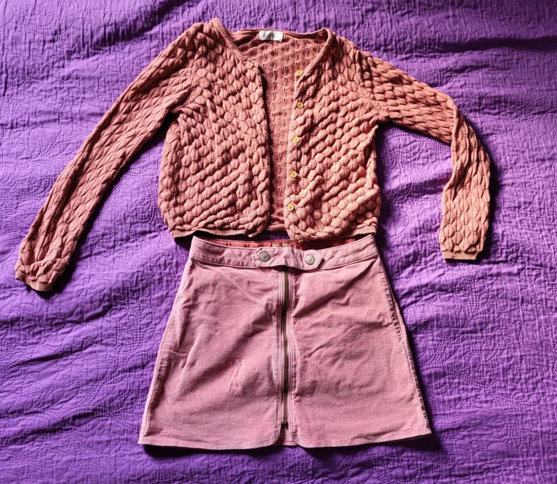 Ocuvano, kratko noseno. Bez mane. Suknja Zara vel.140 ali definitivno manji broj. Vestica H&M 128 ali moze i duze se nositi (slobodno ide i do vel.134). Sve zajedno 6 eura.