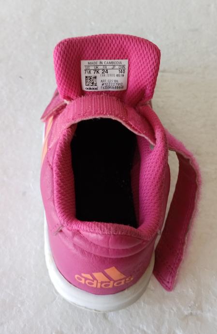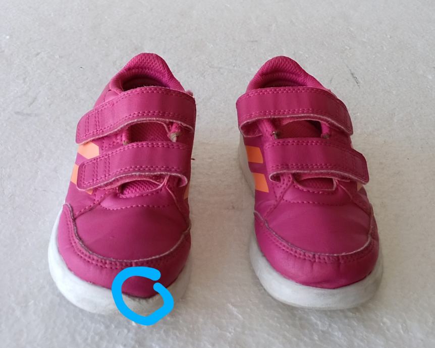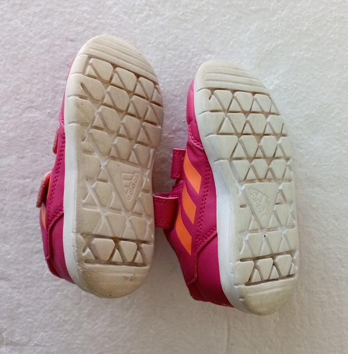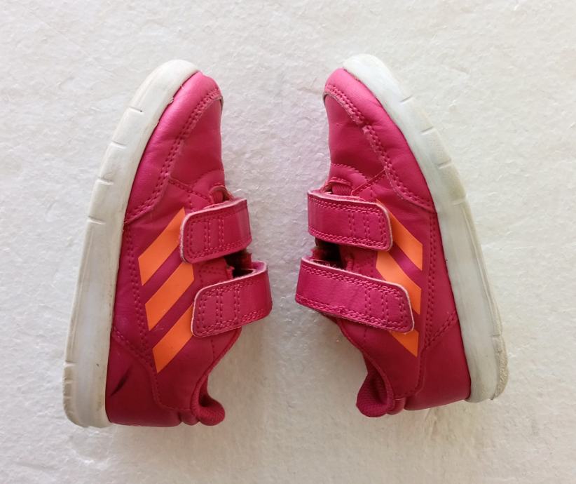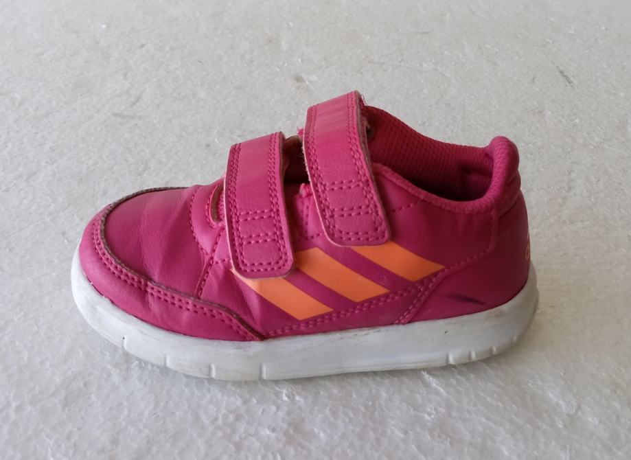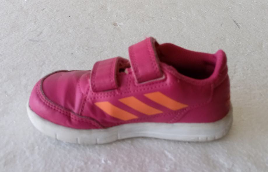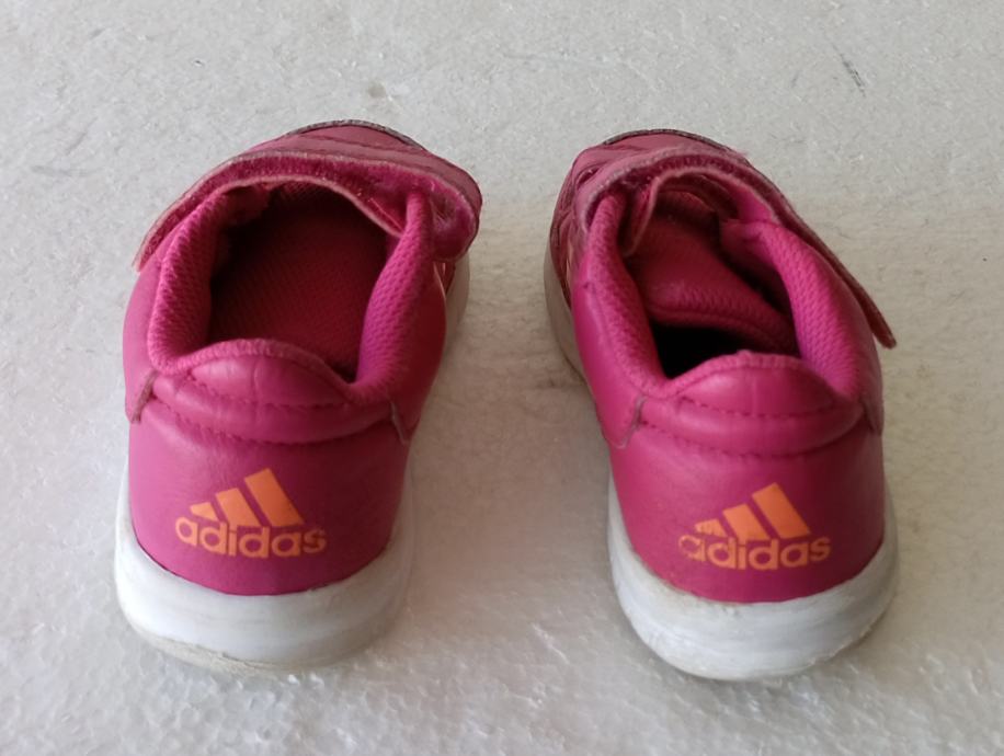 ADIDAS dječje tenisice već. 24 (unutrašnje gazište 14 cm). Gornjište od umjetne kože ružičaste boje. Neko vrijeme nošene i očuvane. Jedino na desnoj naprijed sitno oštećenje na gumi. Cijena snižena.