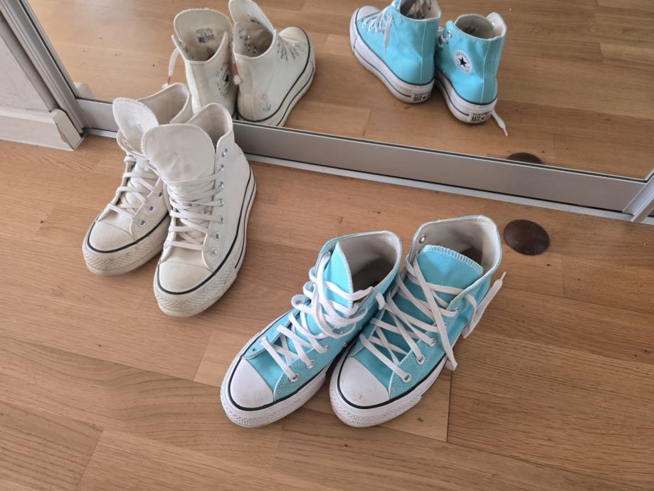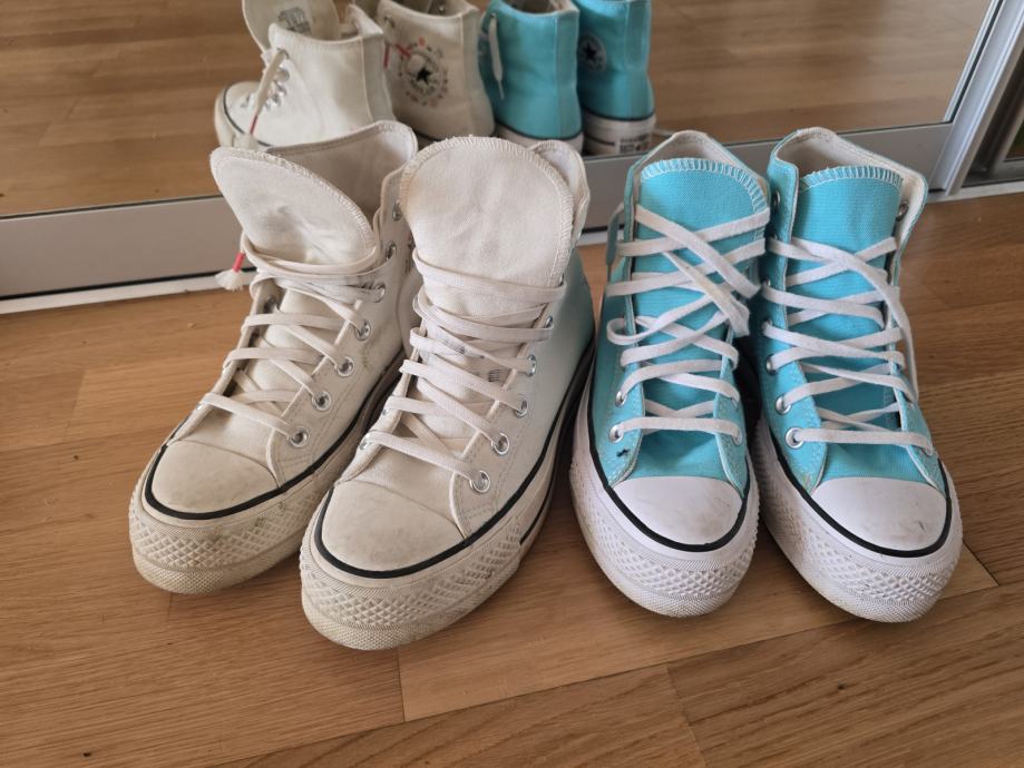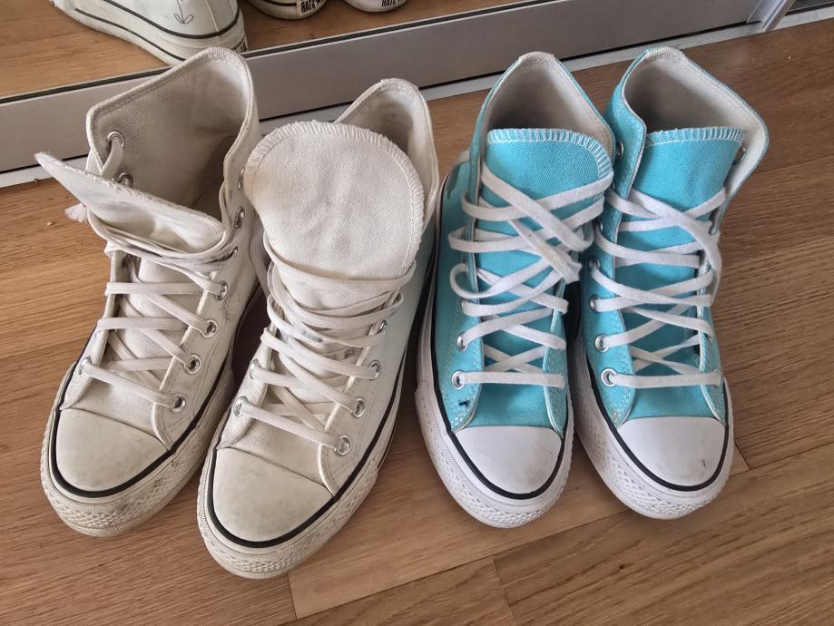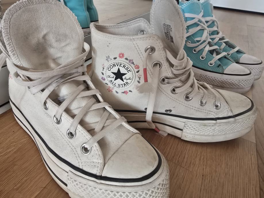 Dva para za jednu cijenu! Vrlo malo nošene dječije konversice - bež br 26.5 i tirkizne 26. Kćerka ih je nosila istovremeno, te će odgovarati nozi veličine 26.
