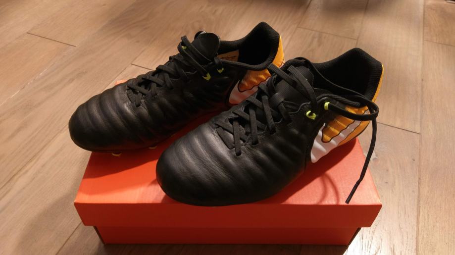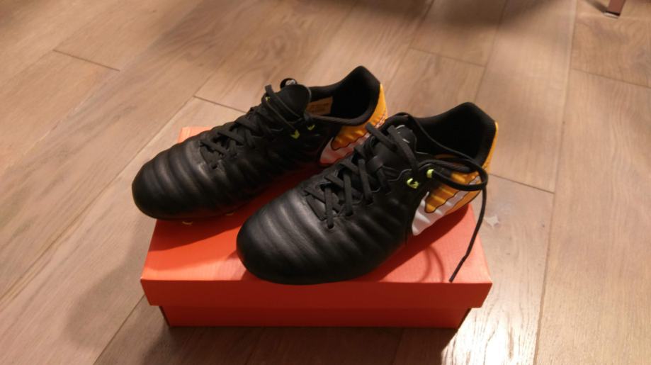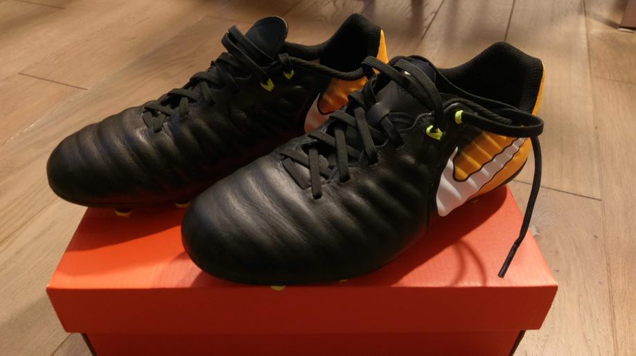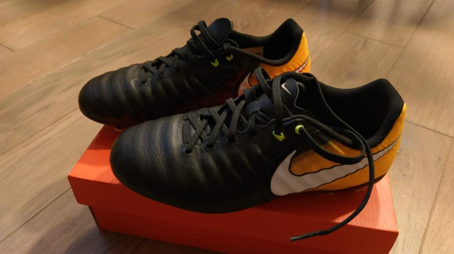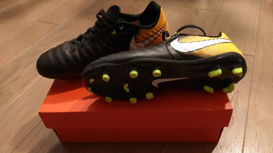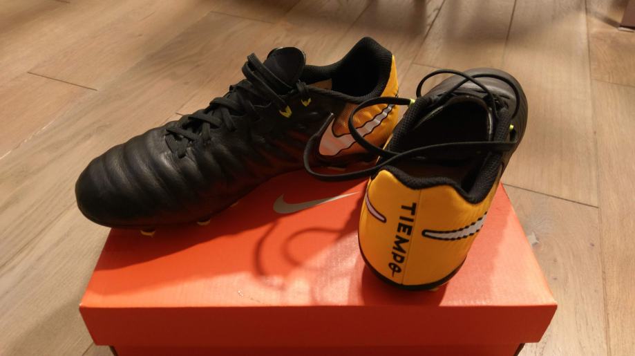 Gotovo nove Nikeove nogometne kopačke Tiempo nošene svega četiri puta. Crno-narančaste s bijelim znakom.