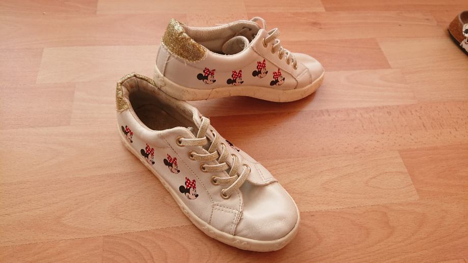 Jedne bijele tenisice sa svjetlucavim detaljima, jedne Minnie Mouse tenisice sa svjetlucavim detaljima i Minnie Mouse sandale, također sa svjetlucavim detaljima.