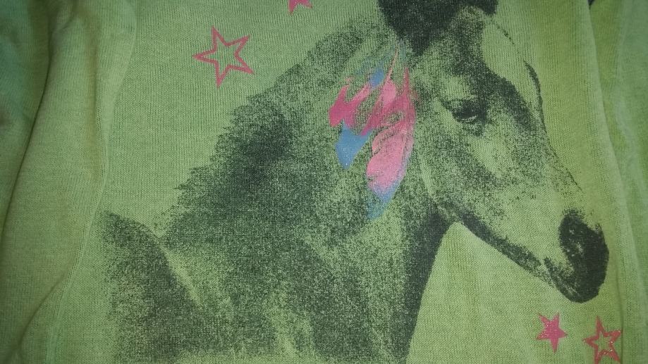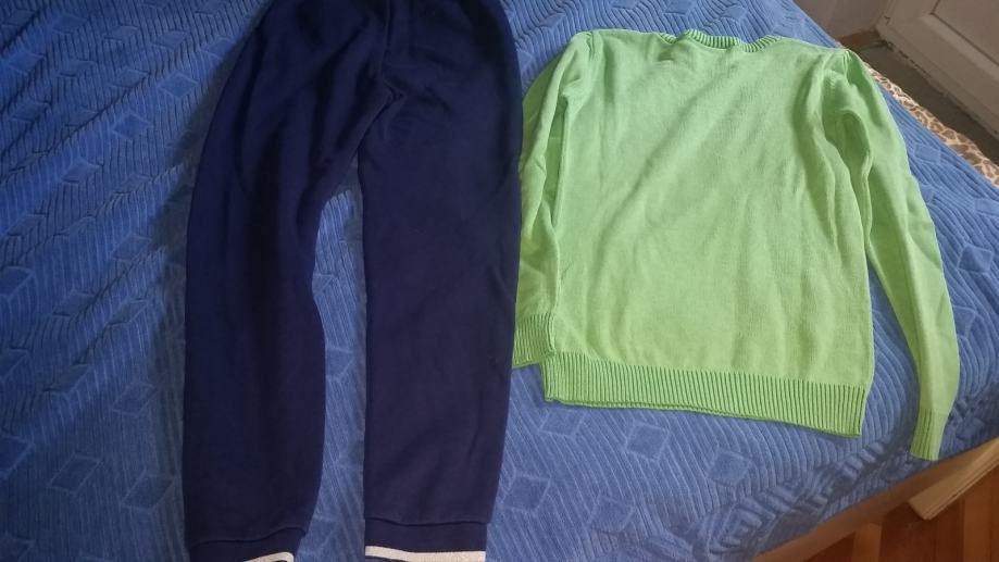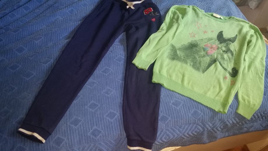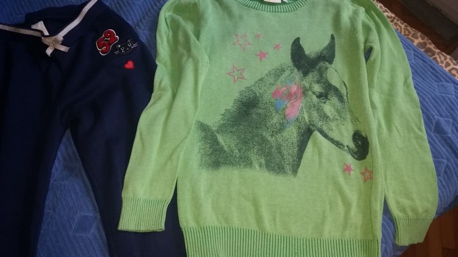 Prodajem lijepi par puta nošen komplet Palomino donji dio trenirke topli i pletena vesta s konjem zelene boje.Trenirka i majica iste su velicine 140.