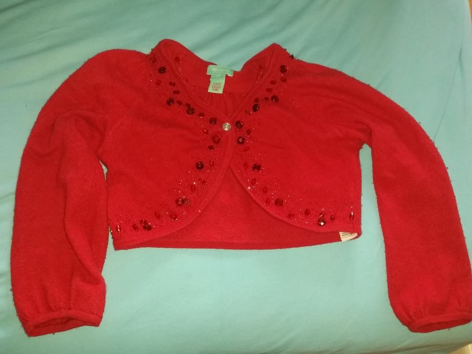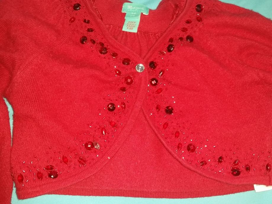 Prodajem predivan bolero sa ukrasnim kamenčićima i šljokicama.Očuvan predivne tamno crvene boje.