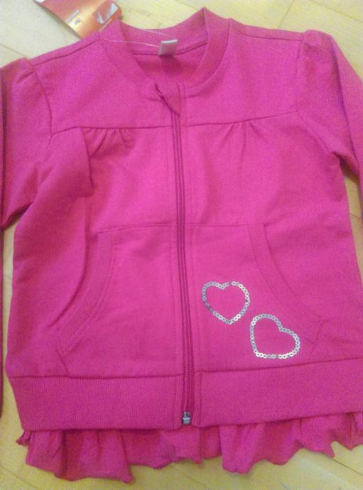 Nova s etiketom roza duksa sa zatvaračem. Na dnu volan i šljokasta srca. Vel 110/116