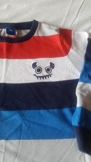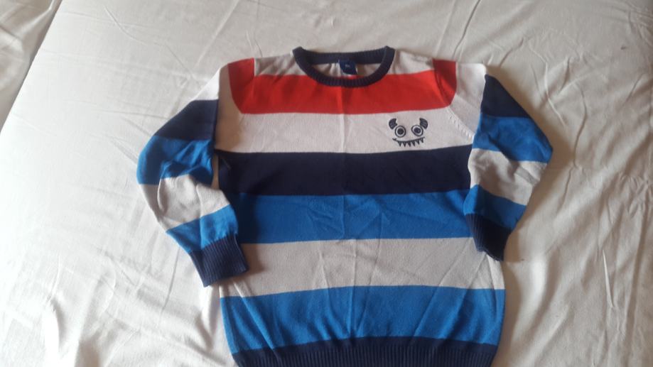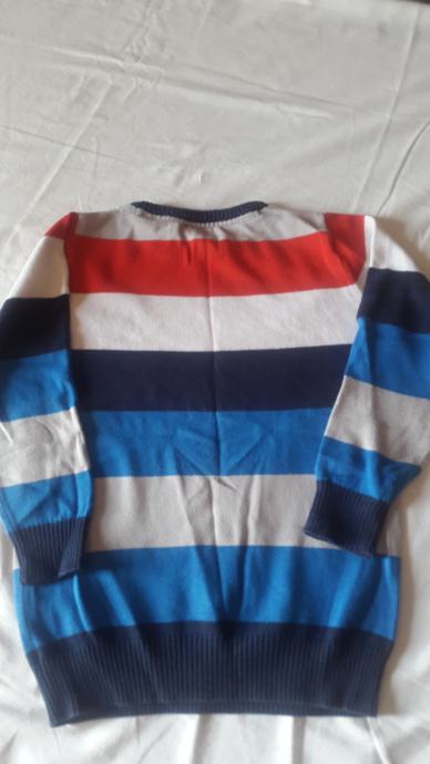 Dječja končana vesta na dugi rukav. Veličina 116. Brand KIKI&KOKO. Vesta je na široke pruge plave, sive , crvene i bijele boje. Jako dobro očuvana, bez flekica i oštećenja
