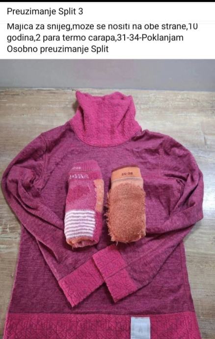 Sve je ocuvano,bez ostecenja.Prodajem majicu koja se moze nositi na 2 strane i 2 para termo carapa,zajedno