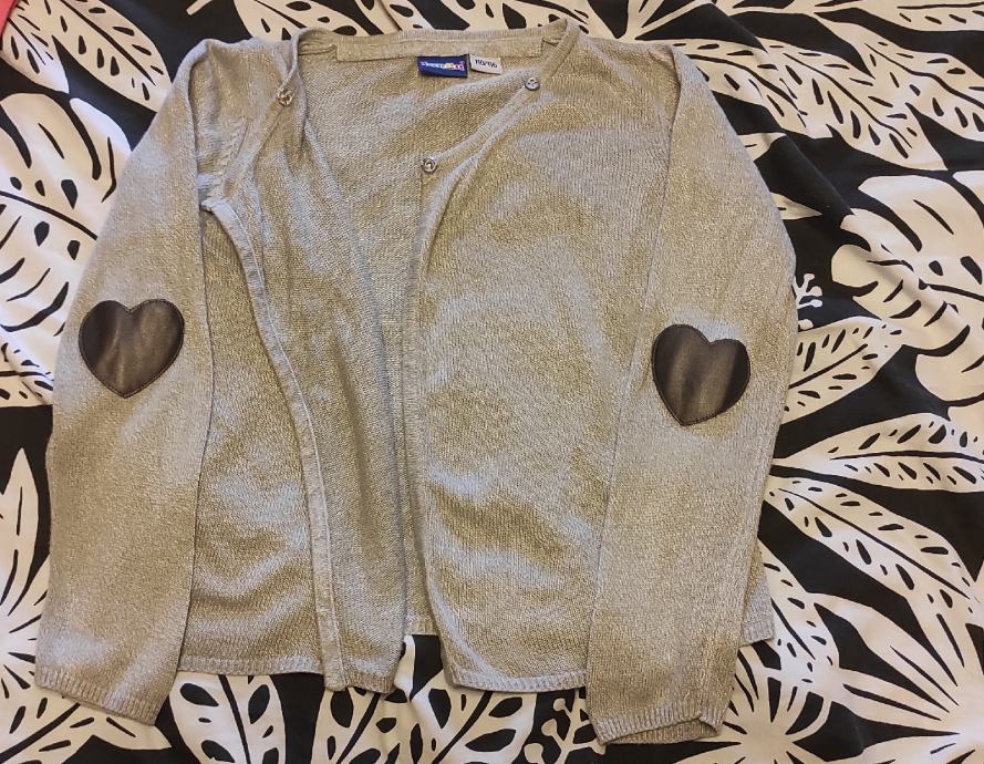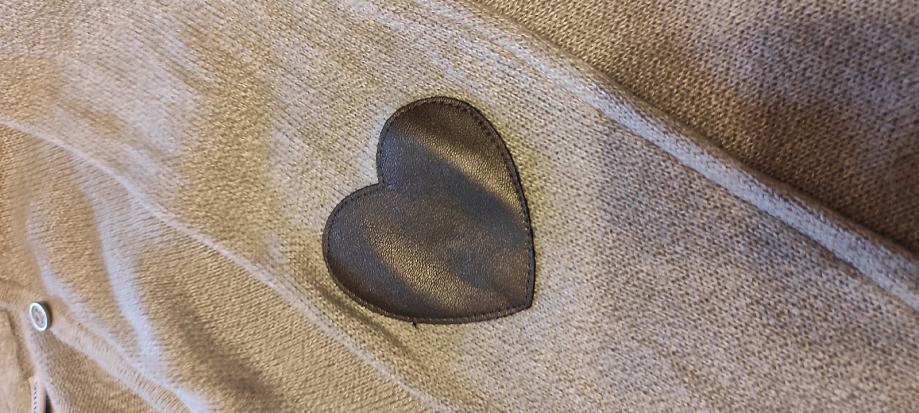 Siva srebrna vesta s asimetričnim kopčanjem i kožnim zakrpama u obliku srca na laktovima.