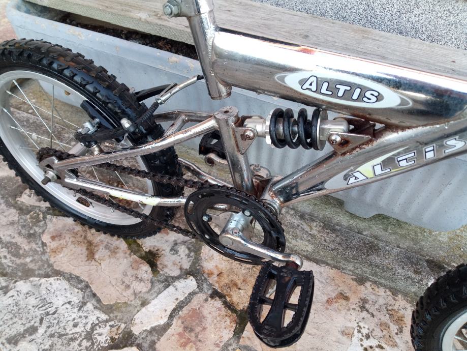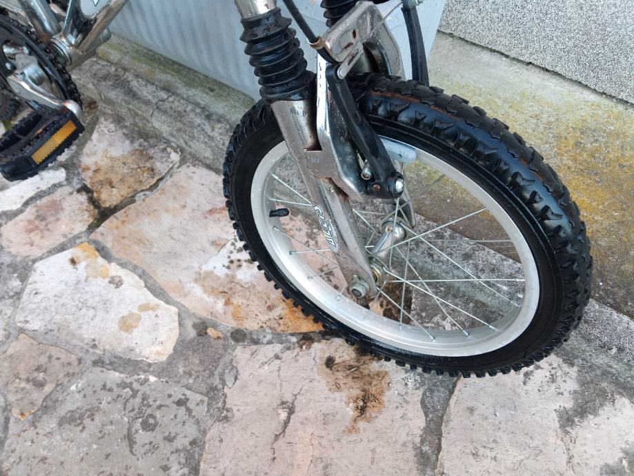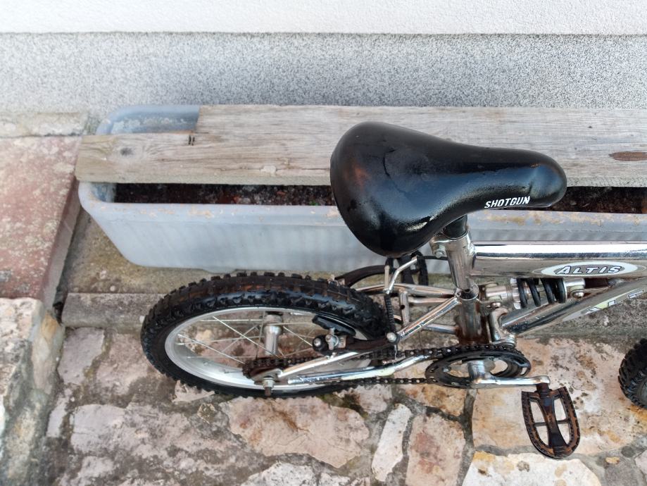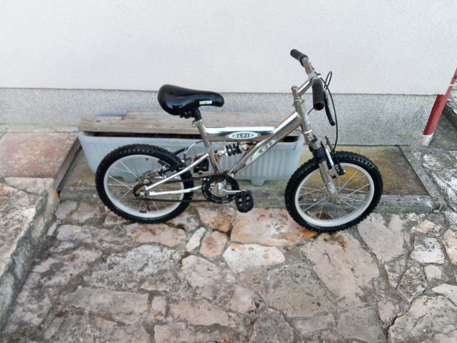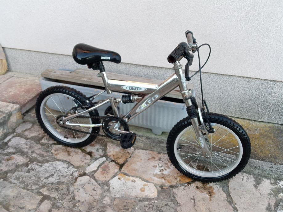 Jedinstven dječji bicikl sa prednjom i stražnjom suspenzijom, kotači veličine 16", bez brzina, obje ručne kočnice, gume ok, sjedalo bez oštećenja.