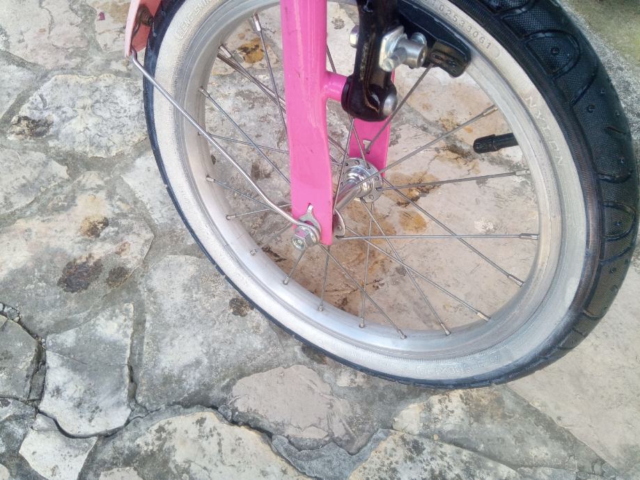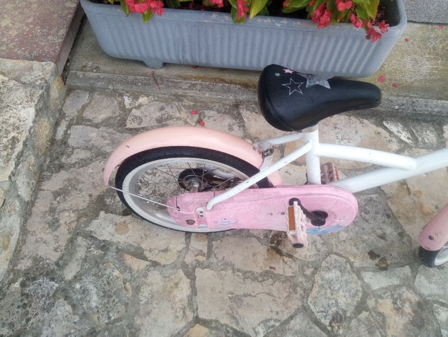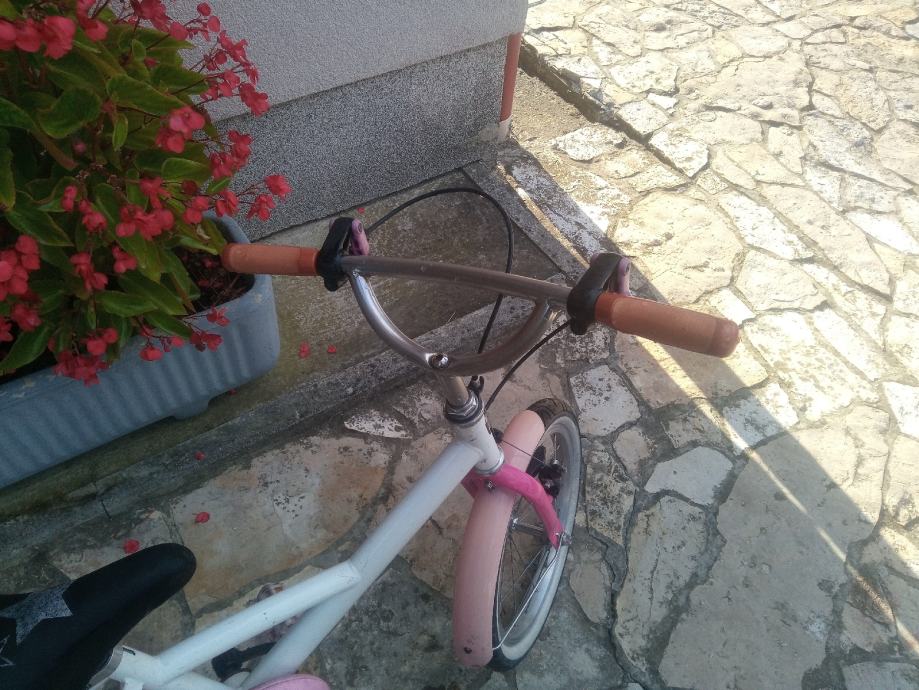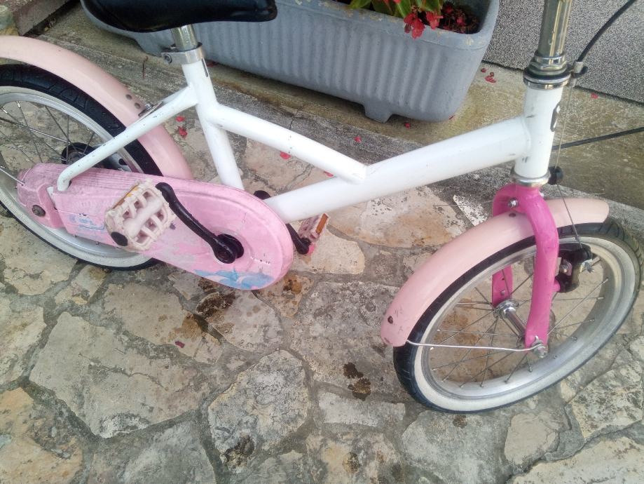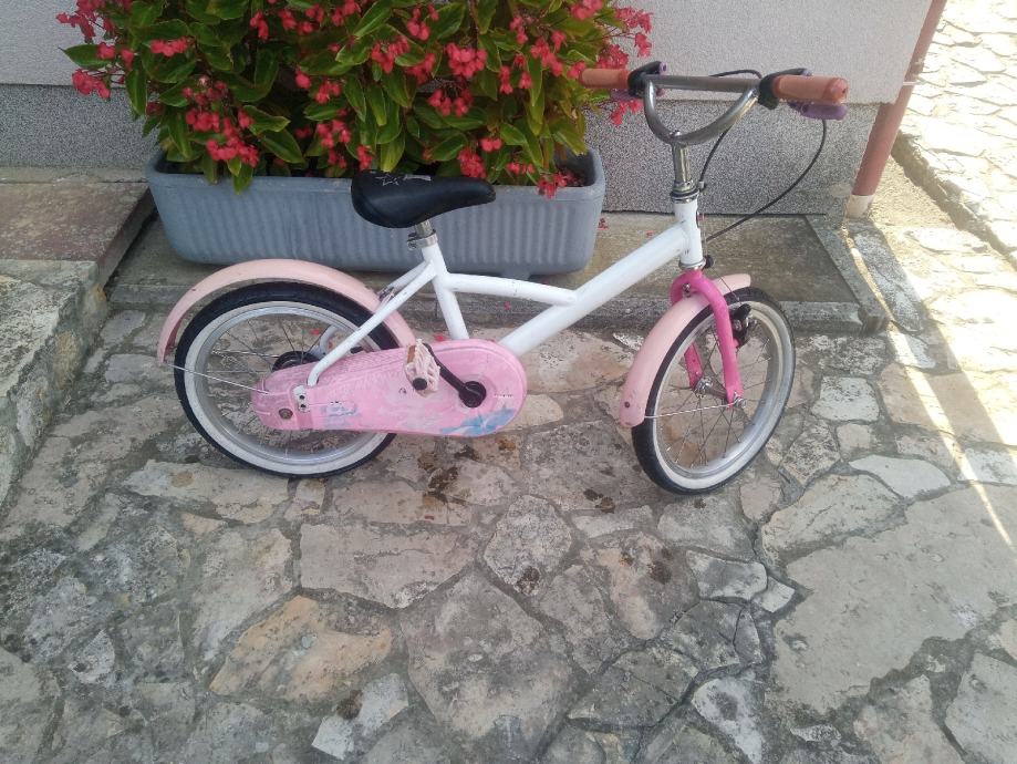 Ženski dječji bicikl B twin, kotači veličine 16", bez brzina, prednja i stražnja ručna kočnica, lancobran, blatobrani, zvonce. Ispravan i spreman za vožnju!