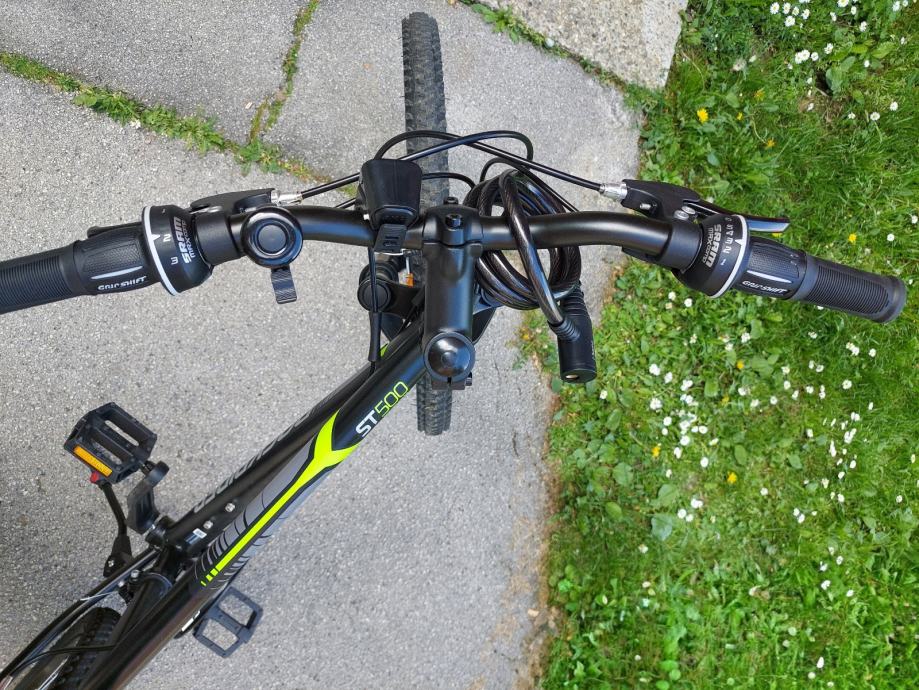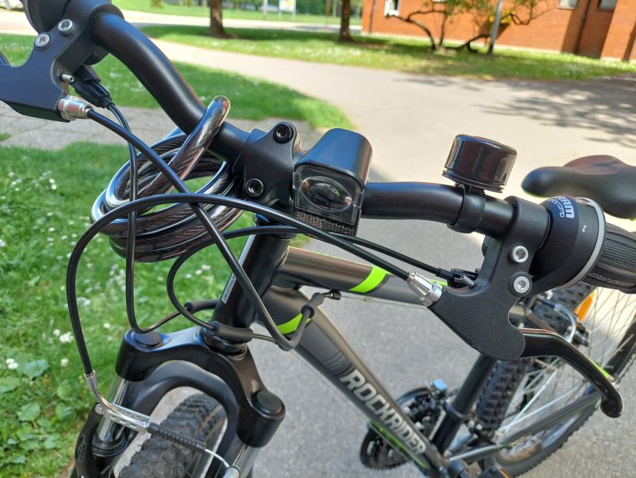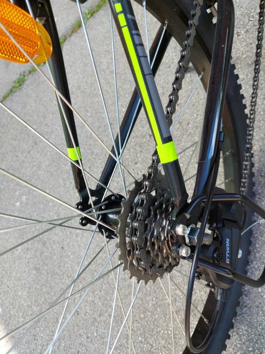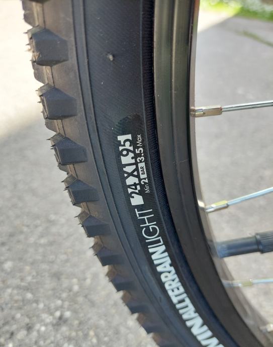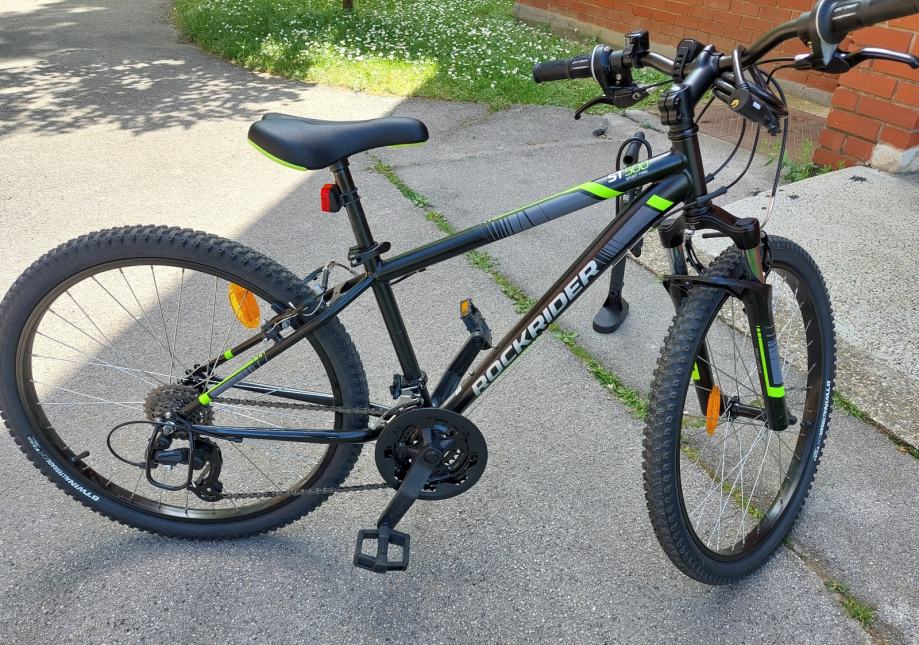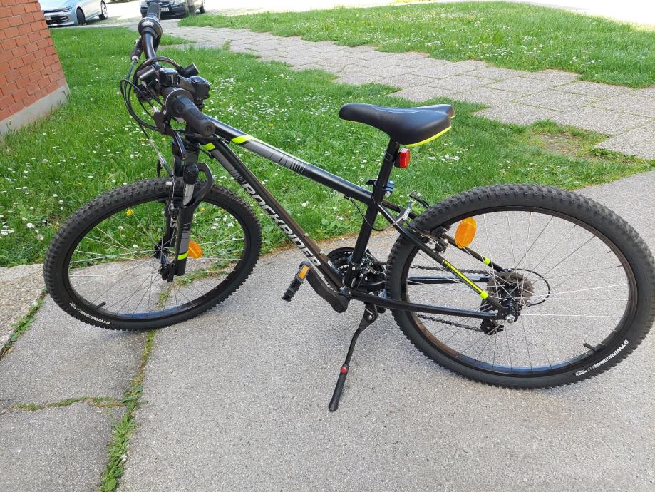 Prodajem dječji brdski bicikl Rockrider s kotačima veličine 24 inča. Bicikl je crne boje sa žuto-zelenim detaljima, opremljen mjenjačem brzina, disk kočnicom na prednjem kotaču i ručnim kočnicama. Gume su terenskog profila, dimenzija 24x1.95, pogodne za različite vrste podloga. Dolazi s postoljem, a na prednjem i stražnjem dijelu nalaze se reflektori.