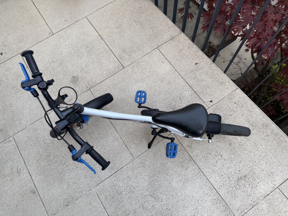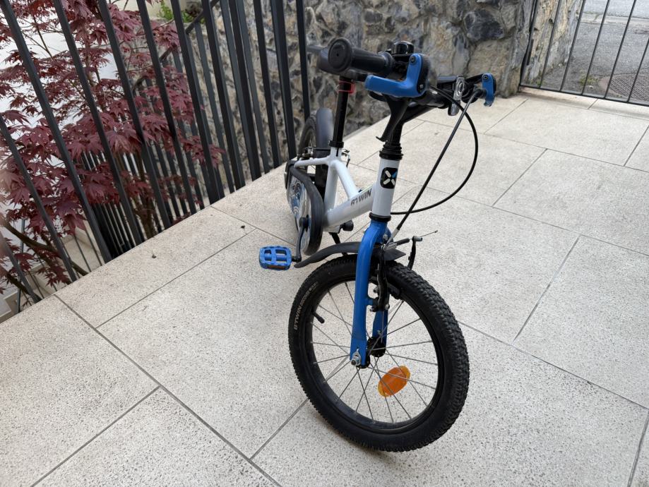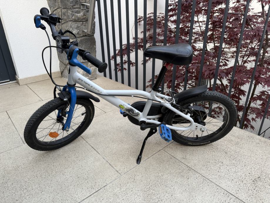 Prodajem dječji bicikl B’Twin Astronaut 500, veličine kotača 16″, kupljen u Decathlonu. Bicikl ima ručne kočnice sprijeda, blatobrane, lancobran, stabilizacijske pomoćne kotače i nogar. Gume su u odličnom stanju, sjedalo neoštećeno, funkcionalan i siguran za vožnju – idealan za uzrast 4‑6 godina.