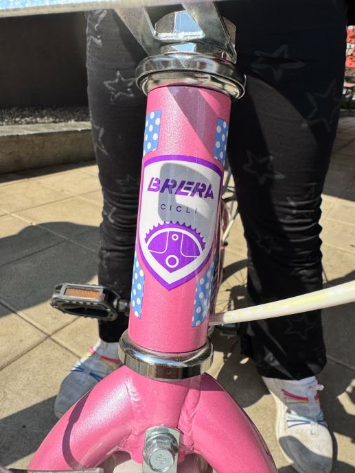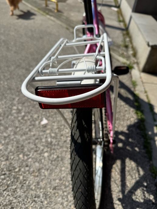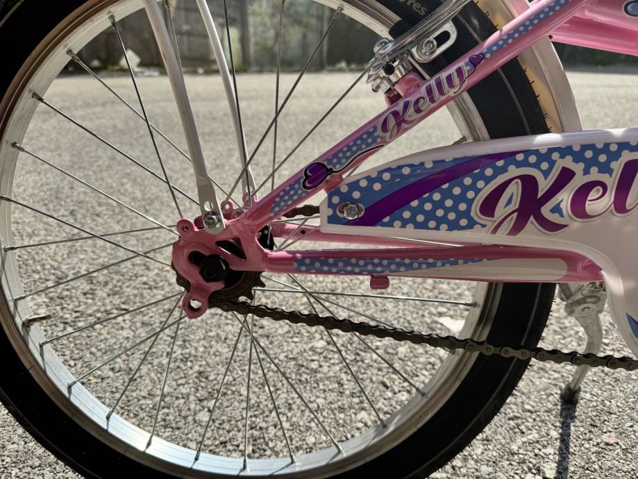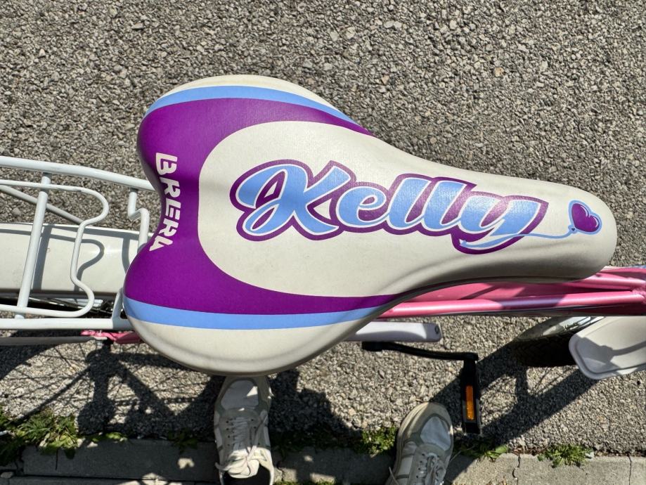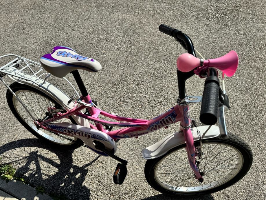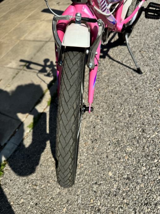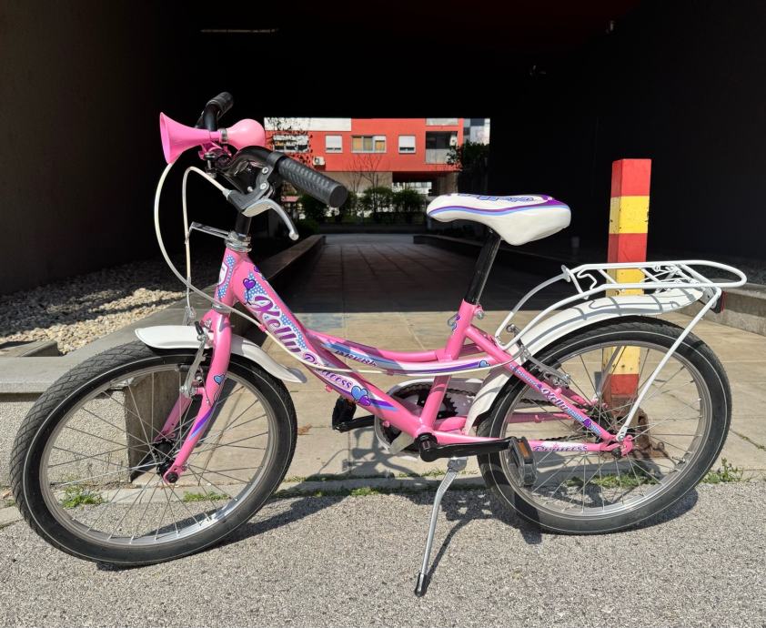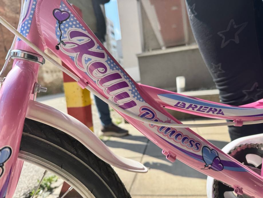 Prodajem dječji bicikl Brera Kelly Princess s kotačima veličine 20 inča, u roze boji s bijelim i ljubičastim detaljima. Bicikl dolazi s prtljažnikom na stražnjem dijelu, ručnom kočnicom, roze upravljačem te trubom. Opremljen je i bočnim stalkom.