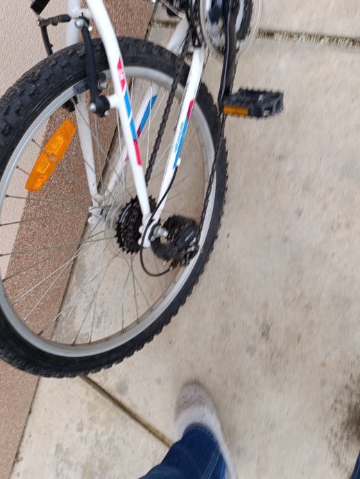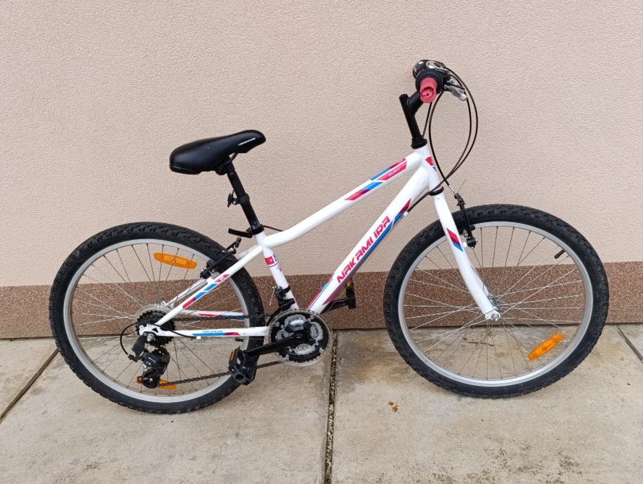 Prodajem dječji bicikl Nakamura s kotačima od 24 inča, prikladan za djevojčice. Bicikl ima bijeli okvir s ružičasto-plavim detaljima, opremljen je s 18 brzina i prednjom amortizacijskom viljicom. Kočnice su prednje i stražnje V-brake tipa. Ručke na upravljaču su ružičaste boje, a bicikl dolazi s praktičnim postoljem za parkiranje. Gume imaju teren profil pogodan za različite uvjete vožnje.