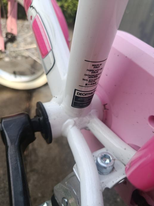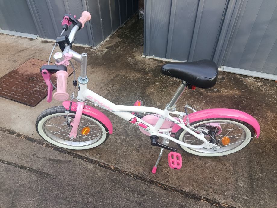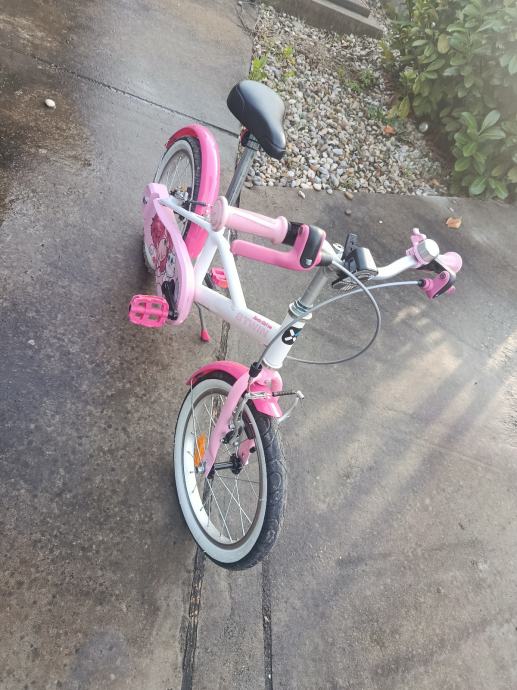 Prodajem dječji bicikl za djevojčice marke B'Twin, bijelo-ružičaste boje s kotačima veličine 16 inča. Bicikl dolazi s blatobranima, postoljem, ručnim kočnicama i ružičastim pedalama i ručkama. Na okviru se nalazi slatka djevojčica s mačkicom. Bicikl je u super stanju.