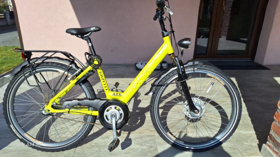 Bicikl u sjanom stanju, očišćen i uređen, gume sjajnog izdanja (2.4 bara), stalak bicikla (nogica) uredna, upravljač uredan.