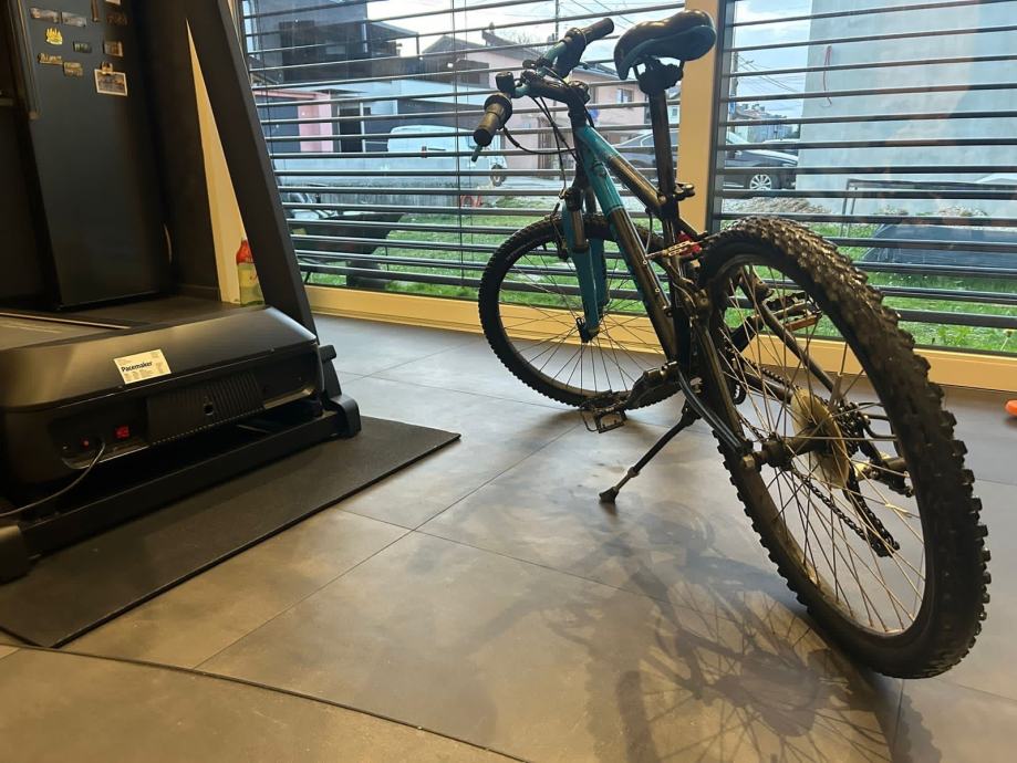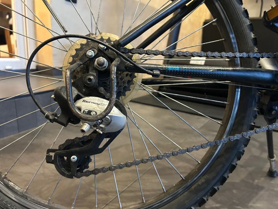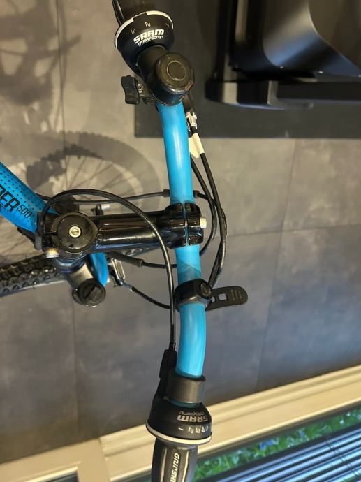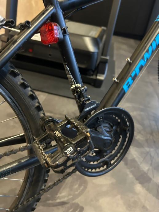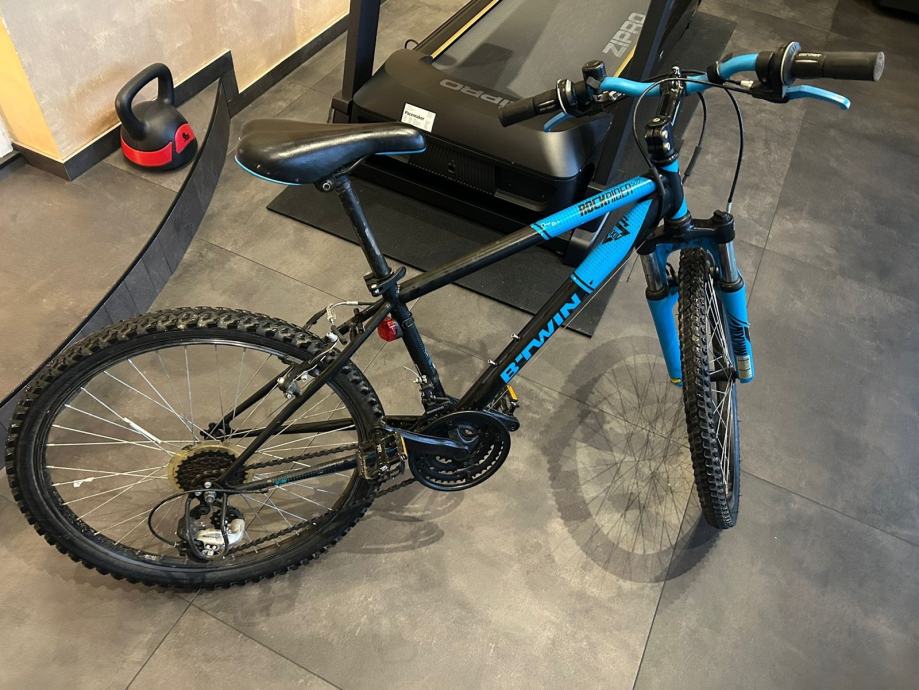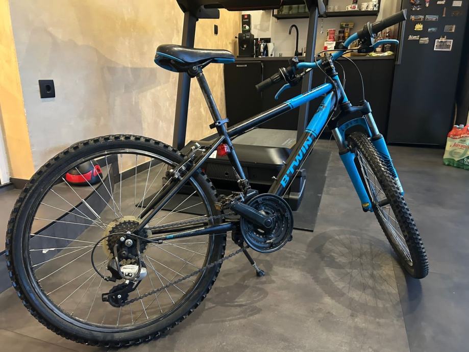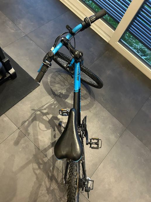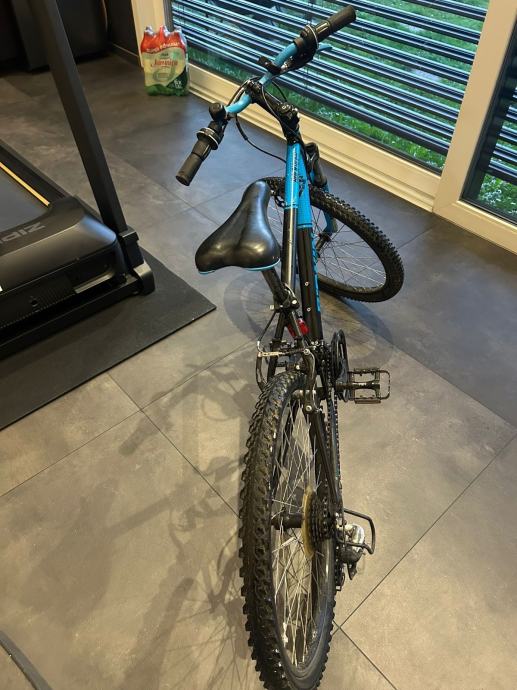 Prodajem dječji bicikl marke B'Twin s kotačima veličine 26 inča. Radi se o brdskom biciklu tamnoplave boje s plavim detaljima, opremljenom Shimano mjenjačem brzina i robusnim gumama pogodnim za različite terene. Bicikl dolazi s postoljem, pedalama i stražnjim svjetlom.