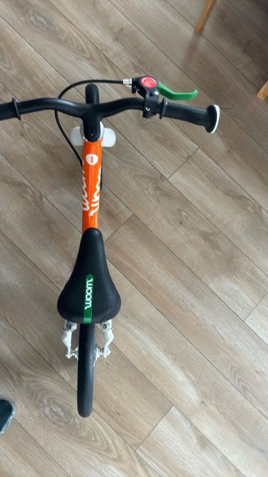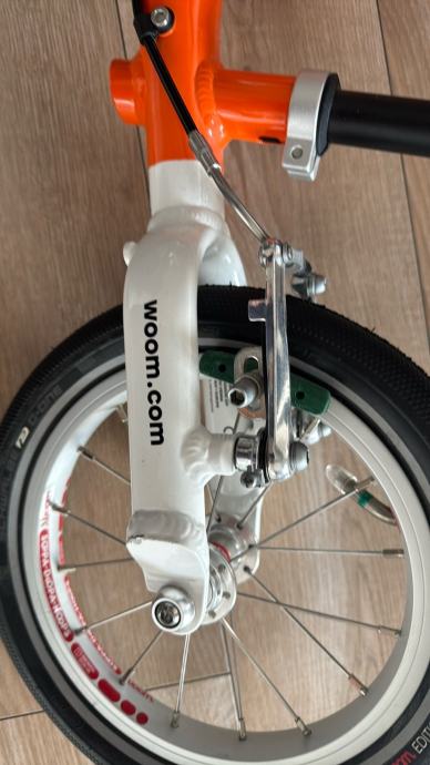 Prodajem novi dječji bicikl WOOM 1 u prepoznatljivoj narančastoj boji s bijelim detaljima. Radi se o balance biciklu (bez pedala) s kotačima veličine 12 inča, koji dolazi opremljen ručnom kočnicom i ergonomskim sjedalom marke WOOM. Upravljač je podesiv, a gume su pneumatske. Bicikl je lagan i kvalitetno izrađen, što je i zaštitni znak ove austrijske marke.