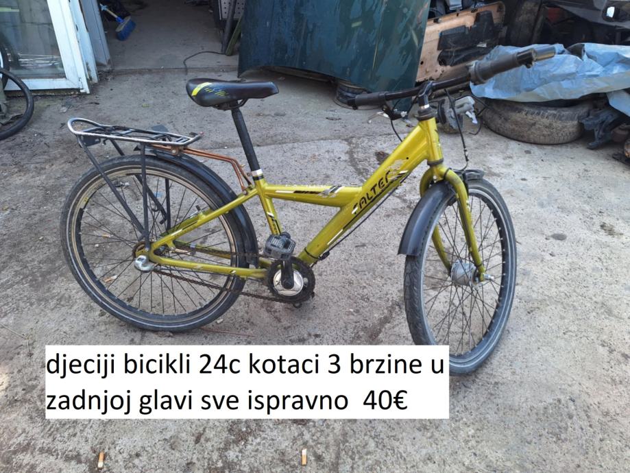prodajem djeciji bicikli 24 cola kotaci ravni gume dobre ima 3 brzine u zadnjoj glavi nozna torpedo kocnica prednja rucna sve ispravno jedino zadnji blatobran puknit i fali ga komad vidi se na jednoj od slika cijena 40 eura fixno