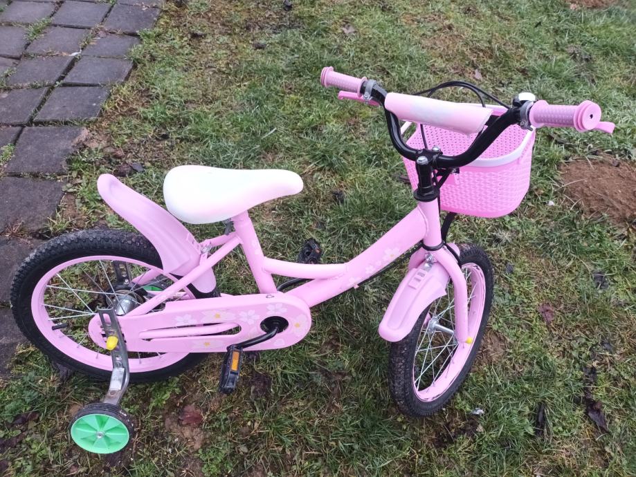 Prodajem dječji bicikl s kotačima veličine 16 inča, u roza boji. Bicikl ima pomoćne kotačiće za lakše učenje vožnje, zaštitu lanca i praktičnu korpu na upravljaču.