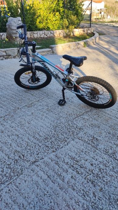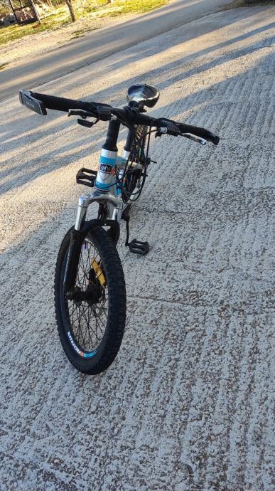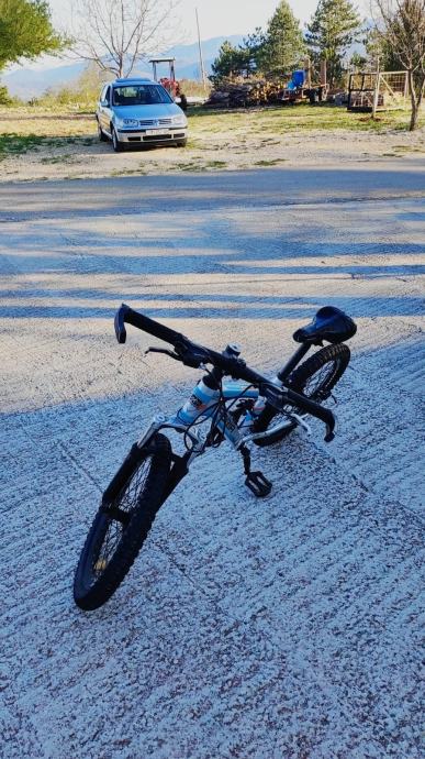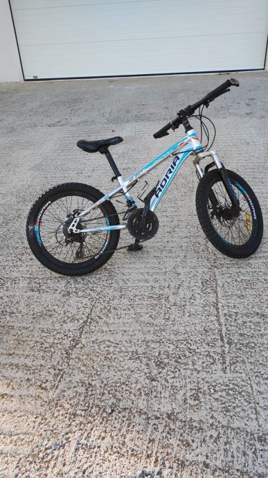 Prodajem dječiji bicikl Adria s kotačima veličine 20 inča. Radi se o brdskom tipu bicikla s prednjom amortizacijskom vilicom, disk kočnicama i mjenjačem brzina. Okvir je bijele boje s plavim detaljima. Bicikl je rabljen.