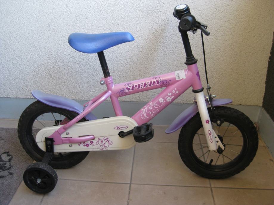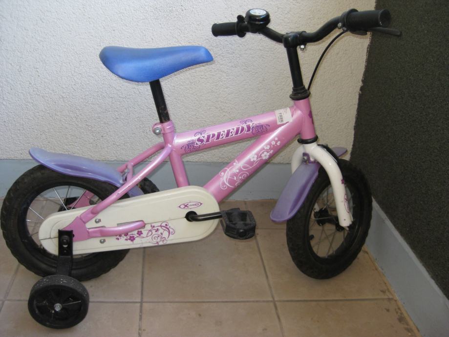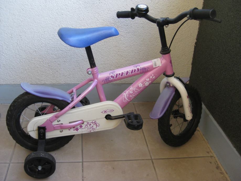 Dječji bicikl s pomoćnim kotačima, kotači 12", malo korišten, potpuno ispravan. Predviđen je za djecu 2-5 godine starosti koja počinju učiti voziti bicikl.