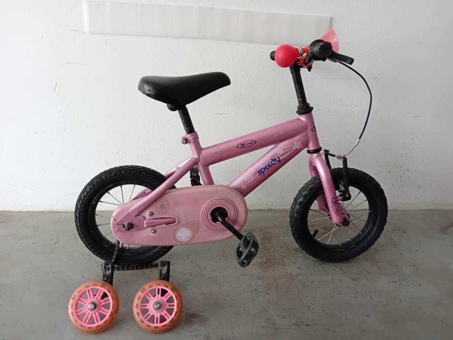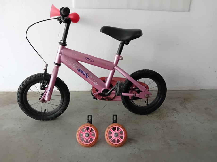 Prodaje se dječji bicikl s pomoćnim kotačima, veličina 12 cola. Na biciklu nedostaje spojnica lanca.