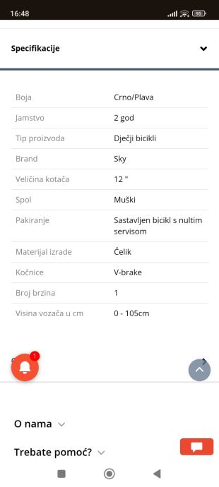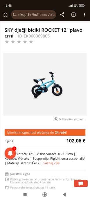 Dječji bicikl s odvojivim pomoćnim kotačima, 12" rocket sky, u slikama specifikacije, na sjedalu vidljivo manje oštećenje, cijena nije fiksna