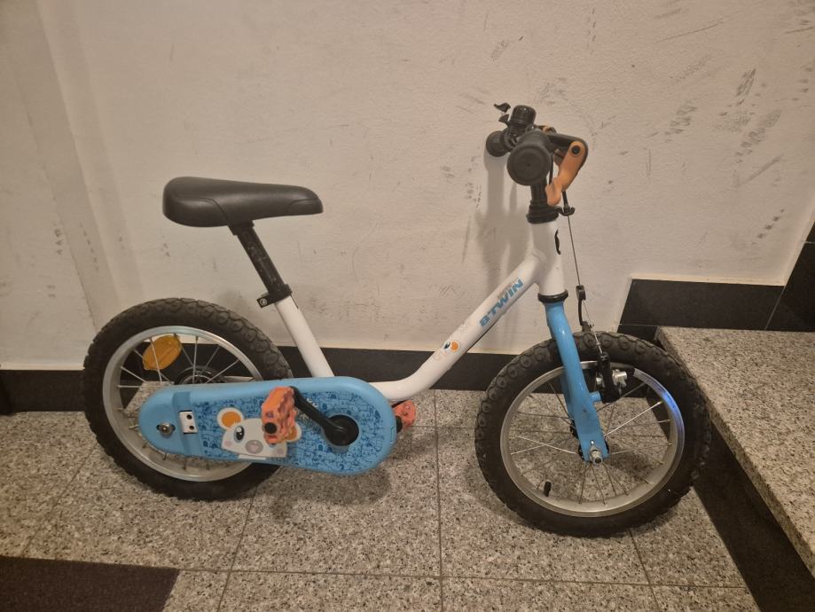 Prodajem dječji bicikl marke B'Twin veličine 14 inča u bijelo-plavoj kombinaciji boja. (Star 3 godine)