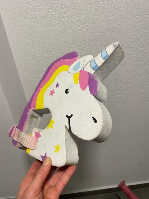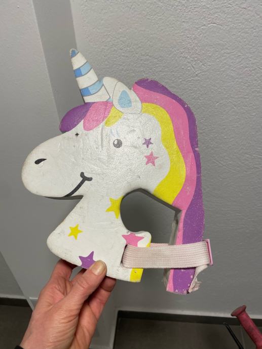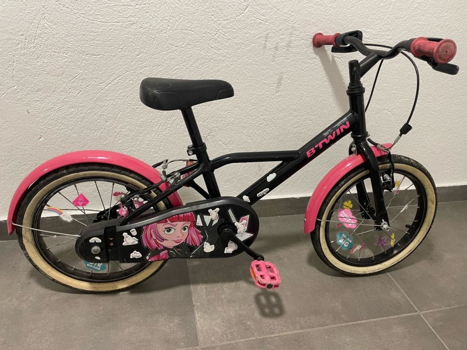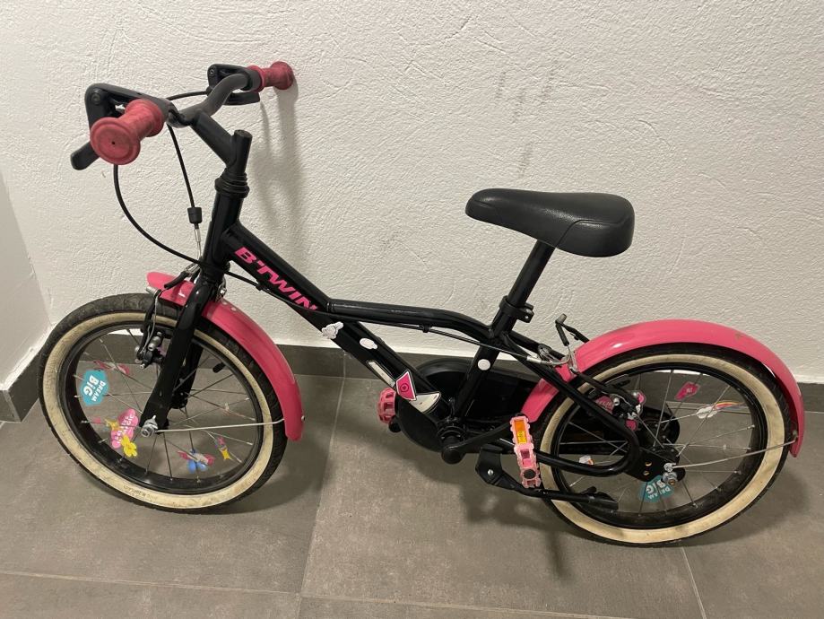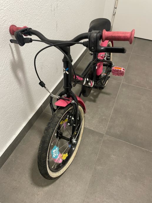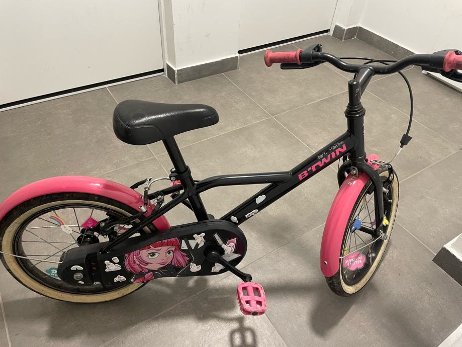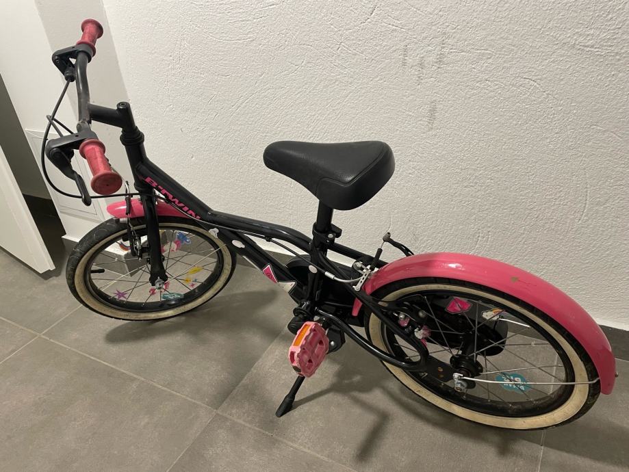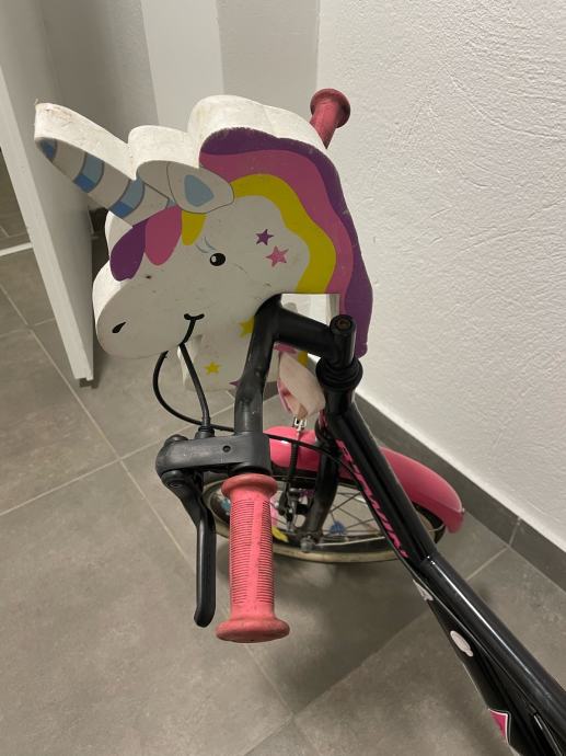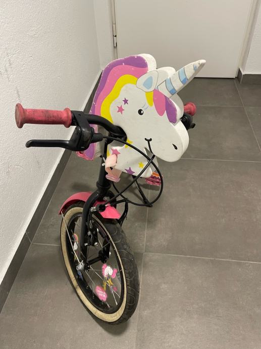 Prodajem dječji bicikl B'Twin veličine kotača 16 inča. Bicikl je crne boje s rozim detaljima s ručnom kočnicom i podesivim sjedalom. Poklanjam dodatak u obliku jednoroga koji se fiksira za guvernal bicikla/romobila sa podesivom trakom. Prvi vlasnik, ocuvan i u voznom stanju. Osobno preuzimanje.