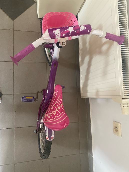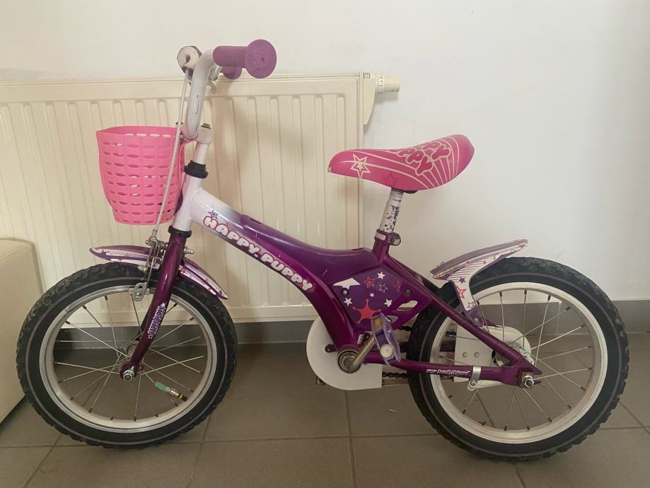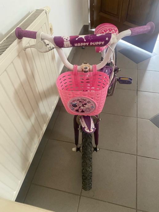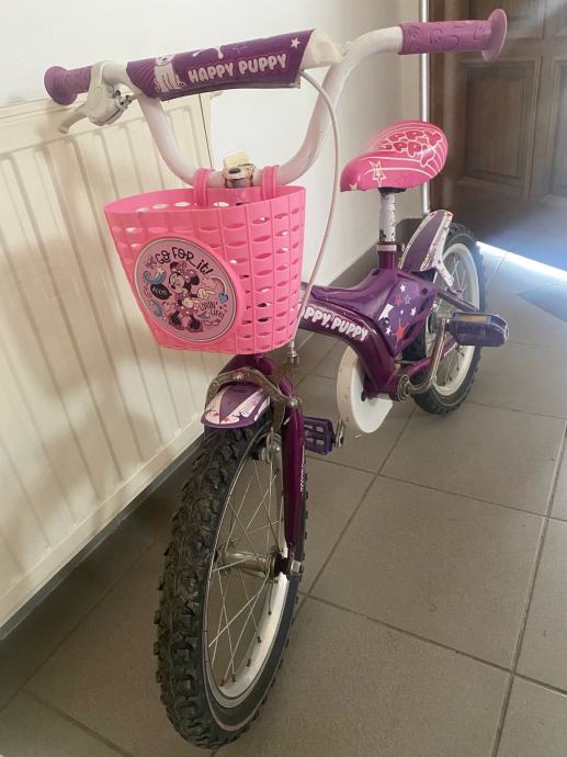 Prodajem dječji bicikl Happy Puppy s kotačima veličine 16 inča. Bicikl je ljubičasto-ružičaste boje, opremljen košarom sprijeda, blatobranima i pogodnim sjedalom podesive visine.