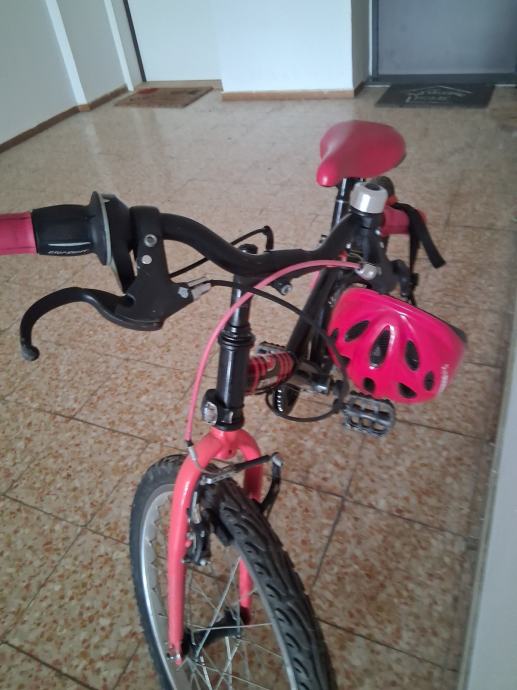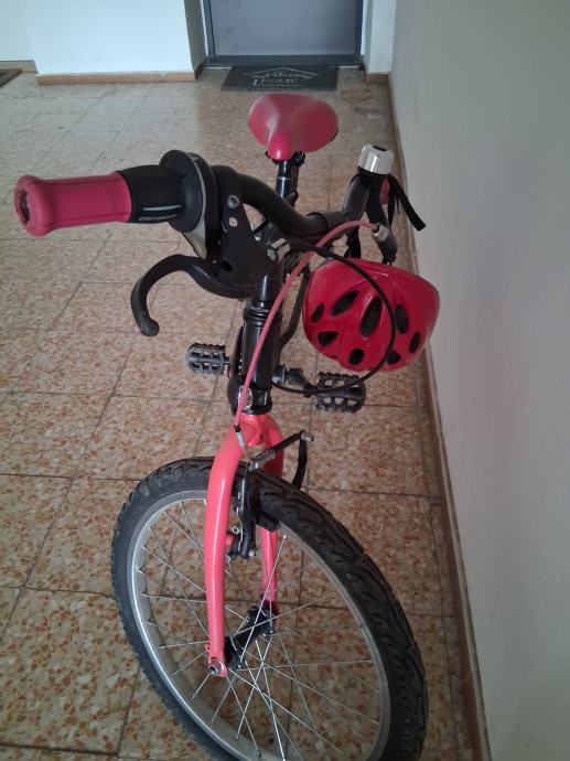 Prodajem dječji bicikl s kotačima od 20 inča u crno-rozoj kombinaciji boja. Bicikl ima crni okvir s rozim detaljima na vilici, sjedalu i zaštiti lanca. Opremljen je s prednjom i stražnjom kočnicom, mjenjačem brzina i pratećim dodacima. Dolazi s rozom kacigom koja odgovara boji bicikla.