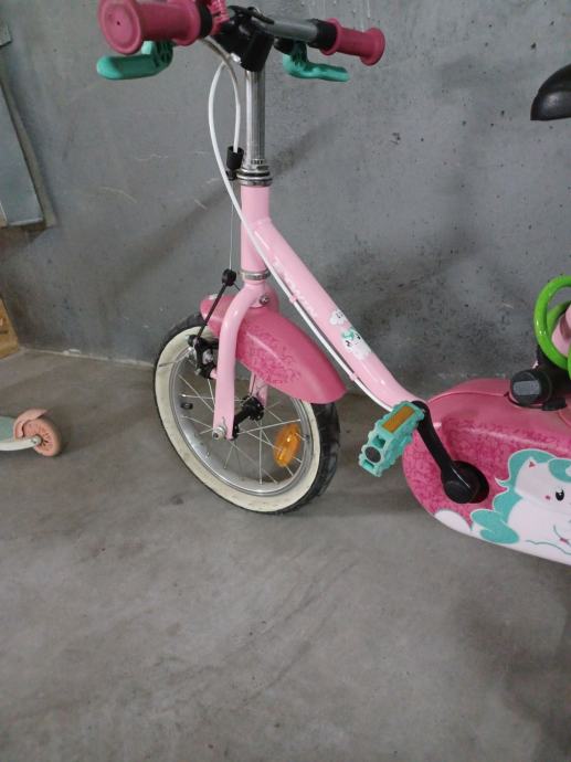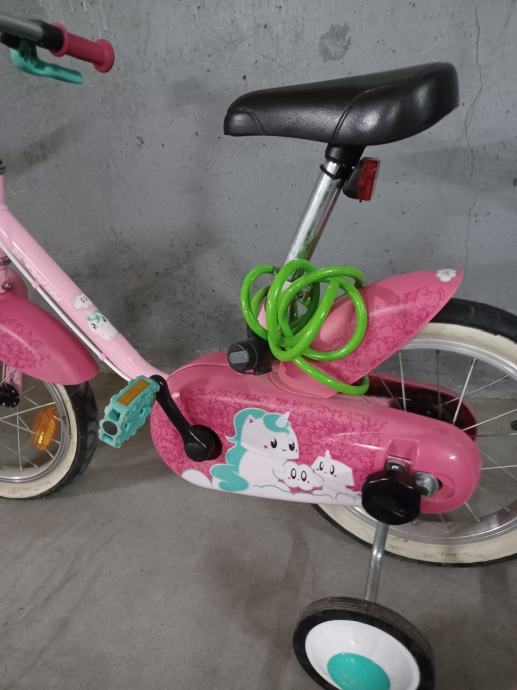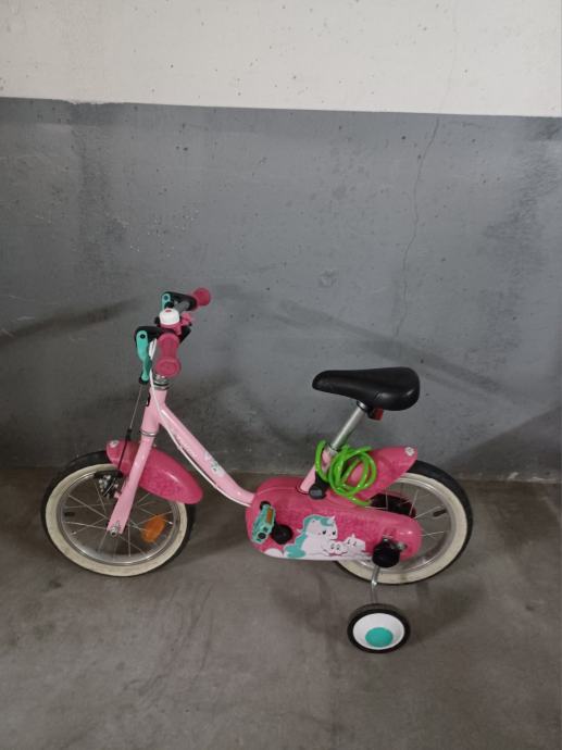 Dječji bicikl pogodan za djecu 4 - 6 godina starosti. Kupljen u Decathlonu. Vozila ga je jedna djevojčica u kraćem periodu. Oštećenja nema.