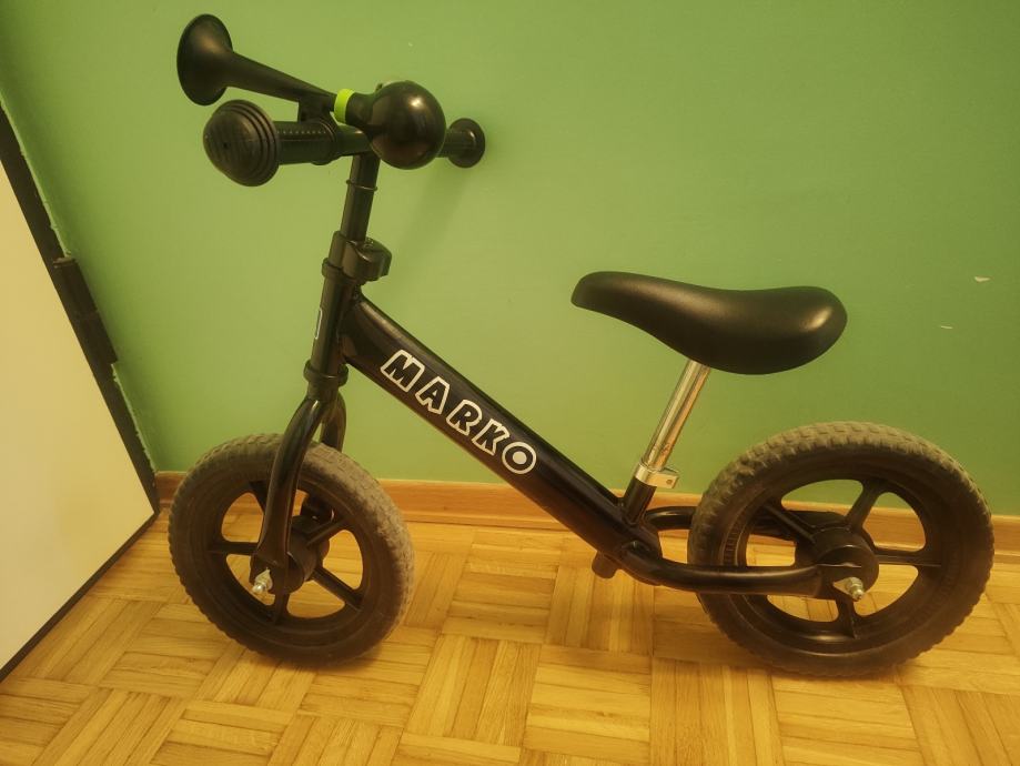 Dječji bicikl bez pedala. Ima ime MARKO pa je i personalizirano. Odlična priprema prije učenja vožnje bicikla bez pomoćnih kotača jer uče djeteta ravnoteži.
