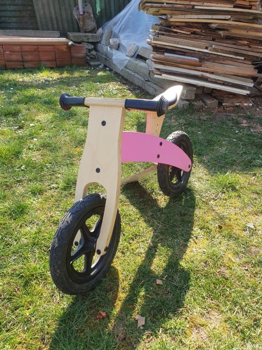 Bicikla je od drveta, ručke su gumene.