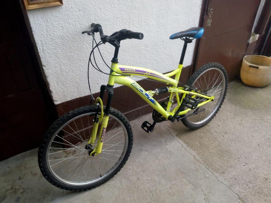 Prodajem dječji bicikl Bolt u veličini kotača 24 inča. Radi se o modelu KS24-FS s punom suspenzijom, prednjom i stražnjom, što mu daje dobru stabilnost na raznim podlogama. Bicikl dolazi s mjenjačem 18 brzina i ručnim kočnicama.